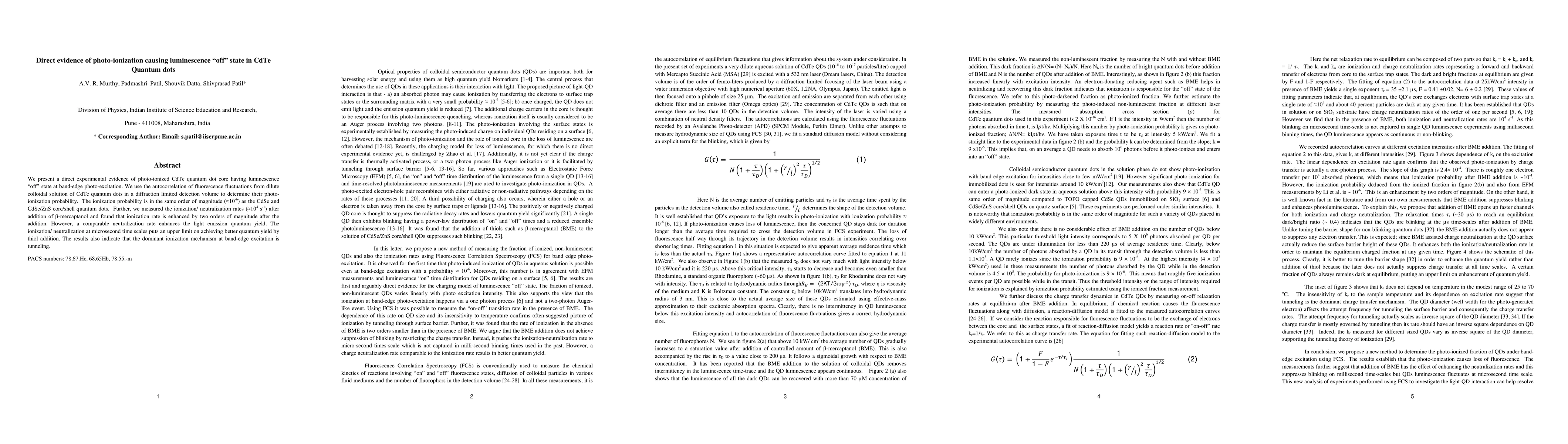 This study provides direct evidence of photo-ionization causing luminescence "off" states in CdTe quantum dots, showing ionization rates comparable to CdSe and CdSe/ZnS core/shell dots. The addition of β-mercaptanol enhances ionization but also improves light emission quantum yield through comparable neutralization rates.