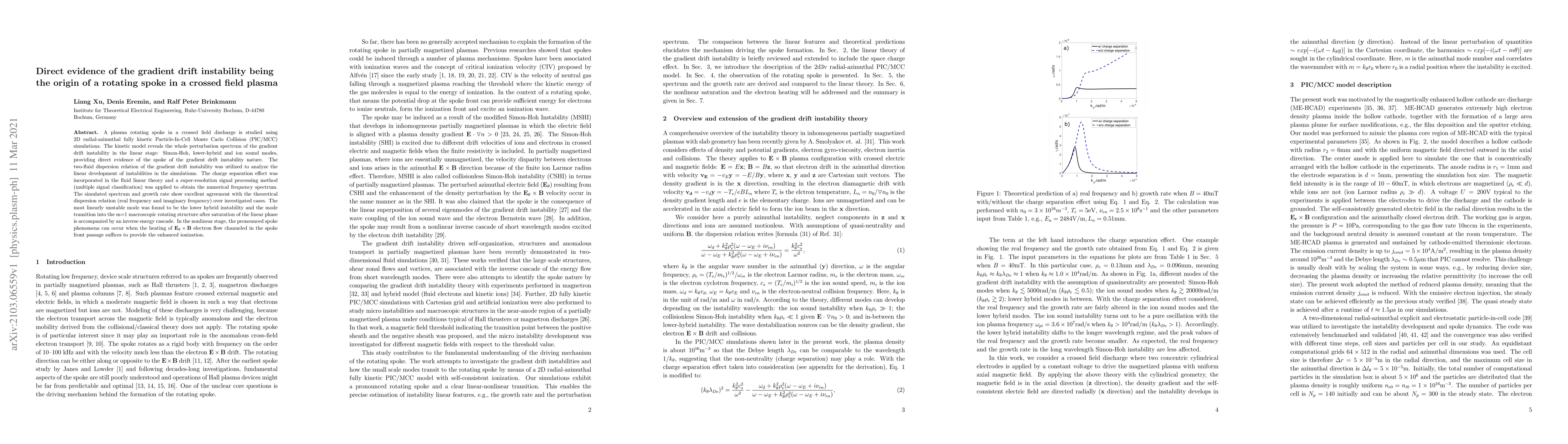 A plasma rotating spoke in a crossed field discharge is studied using 2D radial-azimuthal fully kinetic Particle-In-Cell Monte Carlo Collision (PIC/MCC) simulations. The kinetic model reveals the whole perturbation spectrum of the gradient drift instability in the linear stage: Simon-Hoh, lower-hybrid and ion sound modes, providing direct evidence of the spoke of the gradient drift instability nature. The two-fluid dispersion relation of the gradient drift instability was utilized to analyze the linear development of instabilities in the simulations. The charge separation effect was incorporated in the fluid linear theory and a super-resolution signal processing method (multiple signal classification) was applied to obtain the numerical frequency spectrum. The simulated spectrum and growth rate show excellent agreement with the theoretical dispersion relation (real frequency and imaginary frequency) over investigated cases. The most linearly unstable mode was found to be the lower hybrid instability and the mode transition into the m=1 macroscopic rotating structure after saturation of the linear phase is accompanied by an inverse energy cascade. In the nonlinear stage, the pronounced spoke phenomena can occur when the heating of $\mathbf{E_{\theta}\times B}$ electron flow channeled in the spoke front passage suffices to provide the enhanced ionization.