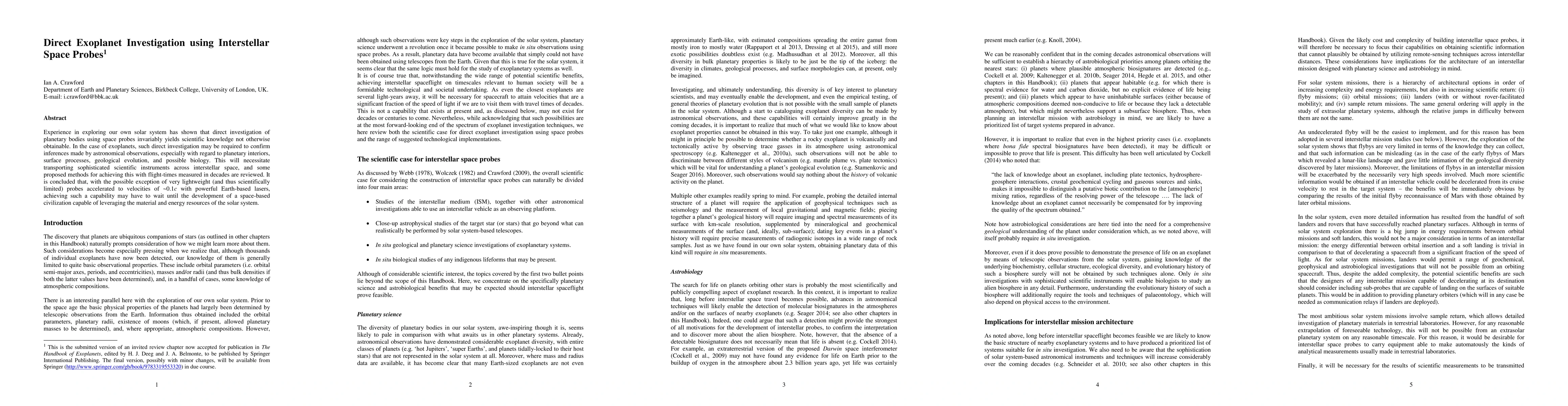 Experience in exploring our own solar system has shown that direct investigation of planetary bodies using space probes invariably yields scientific knowledge not otherwise obtainable. In the case of exoplanets, such direct investigation may be required to confirm inferences made by astronomical observations, especially with regard to planetary interiors, surface processes, geological evolution, and possible biology. This will necessitate transporting sophisticated scientific instruments across interstellar space, and some proposed methods for achieving this with flight-times measured in decades are reviewed. It is concluded that, with the possible exception of very lightweight (and thus scientifically limited) probes accelerated to velocities of ~0.1c with powerful Earth-based lasers, achieving such a capability may have to wait until the development of a space-based civilization capable of leveraging the material and energy resources of the solar system.