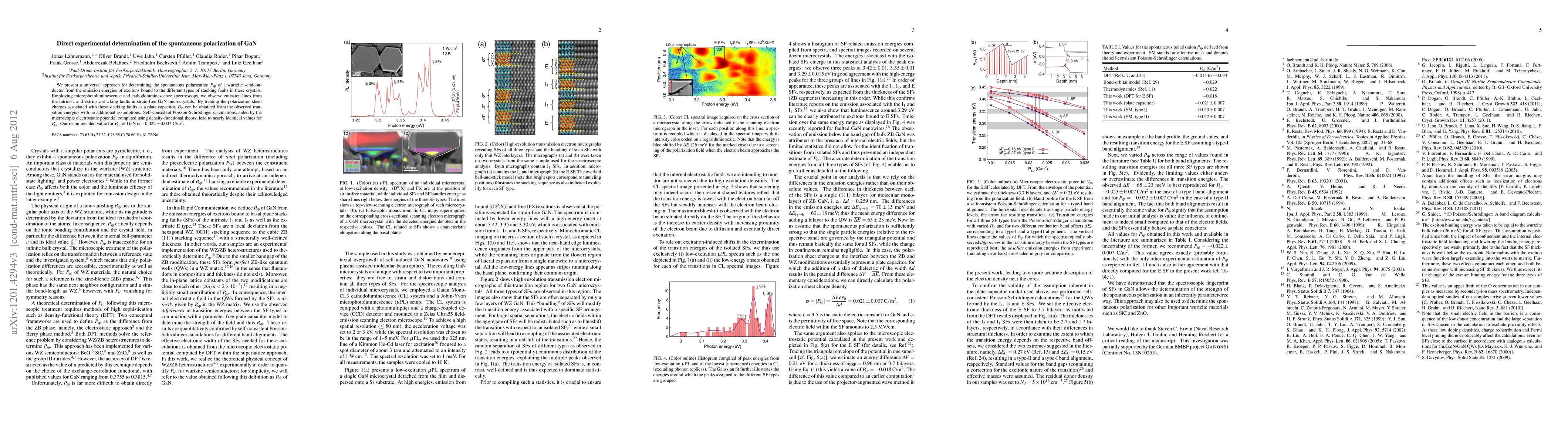 This paper presents a method to directly determine the spontaneous polarization of GaN using micro-photoluminescence and cathodoluminescence spectroscopy, finding a value of -0.022±0.007 C/m² by analyzing emission energies from stacking faults in GaN crystals. The results are validated by self-consistent Poisson-Schroedinger calculations.