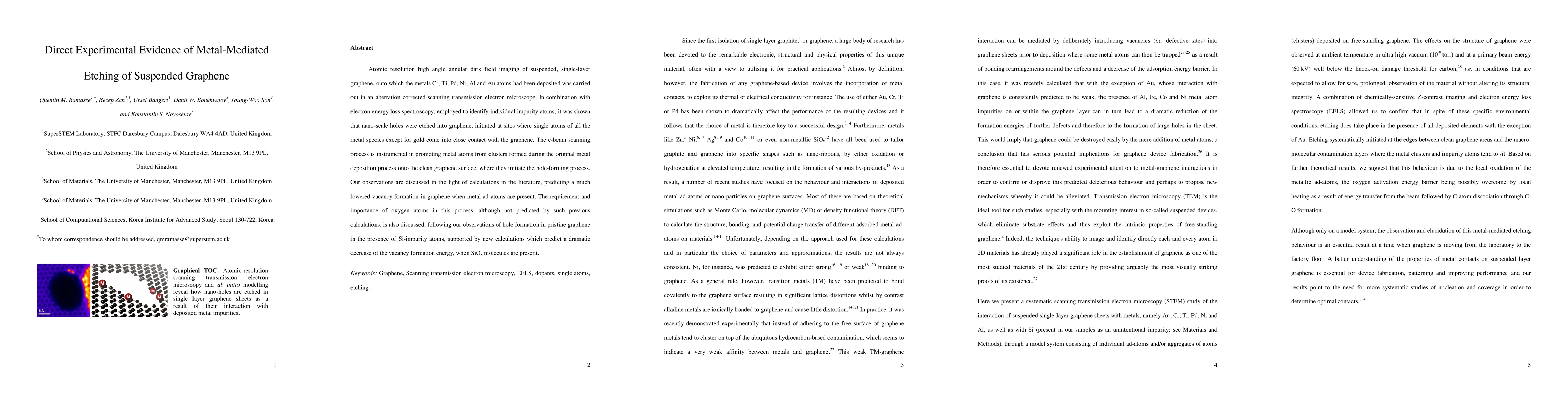 This study provides direct evidence of metals like Cr, Ti, Pd, Ni, and Al etching nano-scale holes into suspended single-layer graphene via an electron beam scanning process. The process is facilitated by metal ad-atoms, with oxygen atoms playing a crucial, previously unpredicted role in lowering vacancy formation energy, as observed with Si-impurity atoms.