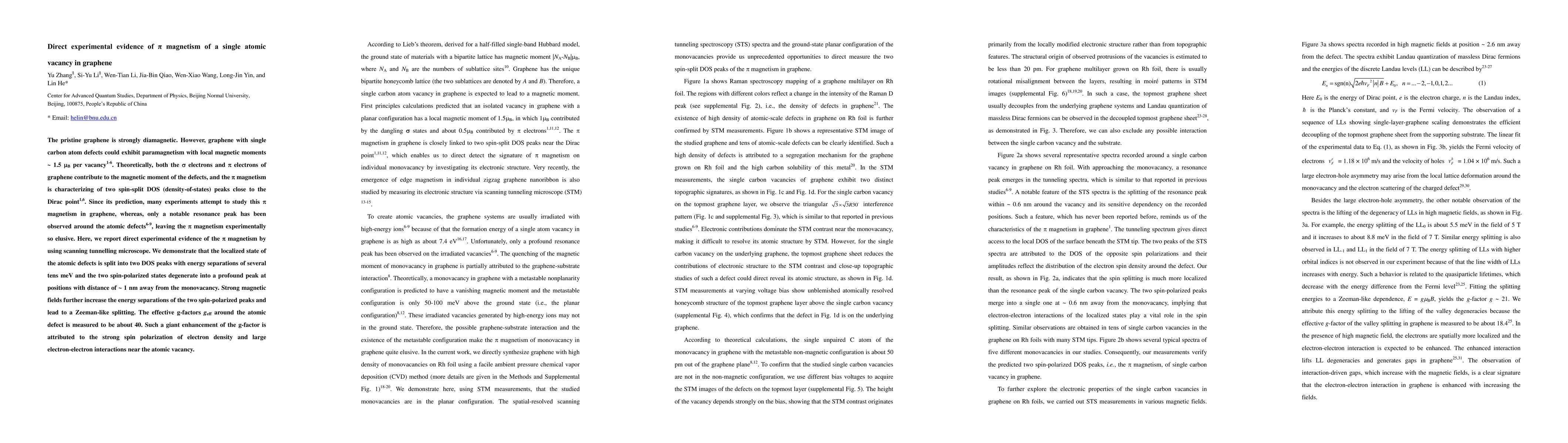The pristine graphene is strongly diamagnetic. However, graphene with single carbon atom defects could exhibit paramagnetism with local magnetic moments ~ 1.5 per vacancy1-6. Theoretically, both the electrons and electrons of graphene contribute to the magnetic moment of the defects, and the pi magnetism is characterizing of two spin-split DOS (density-of-states) peaks close to the Dirac point1,6. Since its prediction, many experiments attempt to study this pi magnetism in graphene, whereas, only a notable resonance peak has been observed around the atomic defects6-9, leaving the pi magnetism experimentally so elusive. Here, we report direct experimental evidence of the pi magnetism by using scanning tunnelling microscope. We demonstrate that the localized state of the atomic defects is split into two DOS peaks with energy separations of several tens meV and the two spin-polarized states degenerate into a profound peak at positions with distance of ~ 1 nm away from the monovacancy. Strong magnetic fields further increase the energy separations of the two spin-polarized peaks and lead to a Zeeman-like splitting. The effective g-factors geff around the atomic defect is measured to be about 40. Such a giant enhancement of the g-factor is attributed to the strong spin polarization of electron density and large electron-electron interactions near the atomic vacancy.