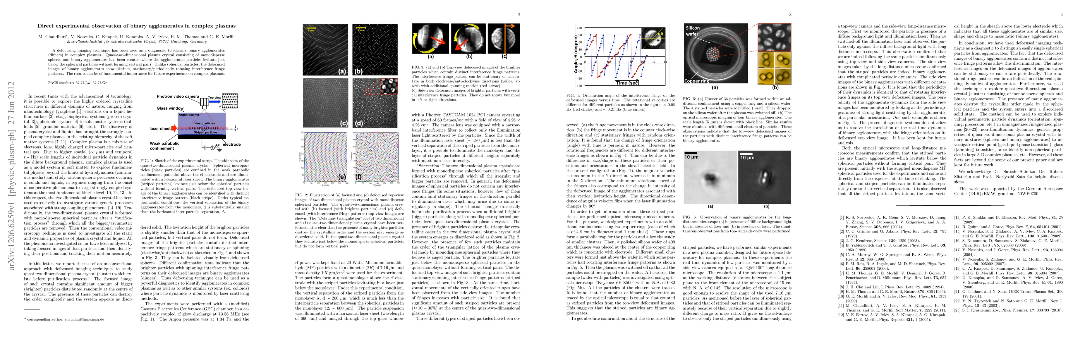This study employs a defocusing imaging technique to identify binary agglomerates in complex plasmas, revealing distinct interference fringe patterns in quasi-two-dimensional plasma crystals. These findings provide a fundamental diagnostic tool for future research on complex plasmas.