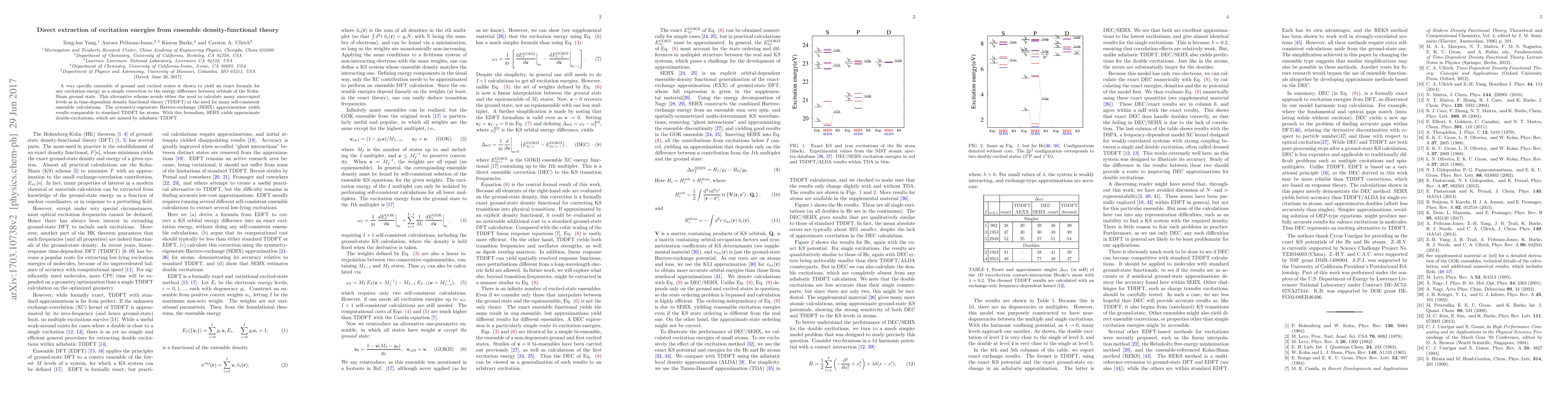 A very specific ensemble of ground and excited states is shown to yield an exact formula for any excitation energy as a simple correction to the energy difference between orbitals of the Kohn-Sham ground state. This alternative scheme avoids either the need to calculate many unoccupied levels as in time-dependent density functional theory (TDDFT) or the need for many self-consistent ensemble calculations. The symmetry-eigenstate Hartree-exchange (SEHX) approximation yields results comparable to standard TDDFT for atoms. With this formalism, SEHX yields approximate double-excitations, which are missed by adiabatic TDDFT.