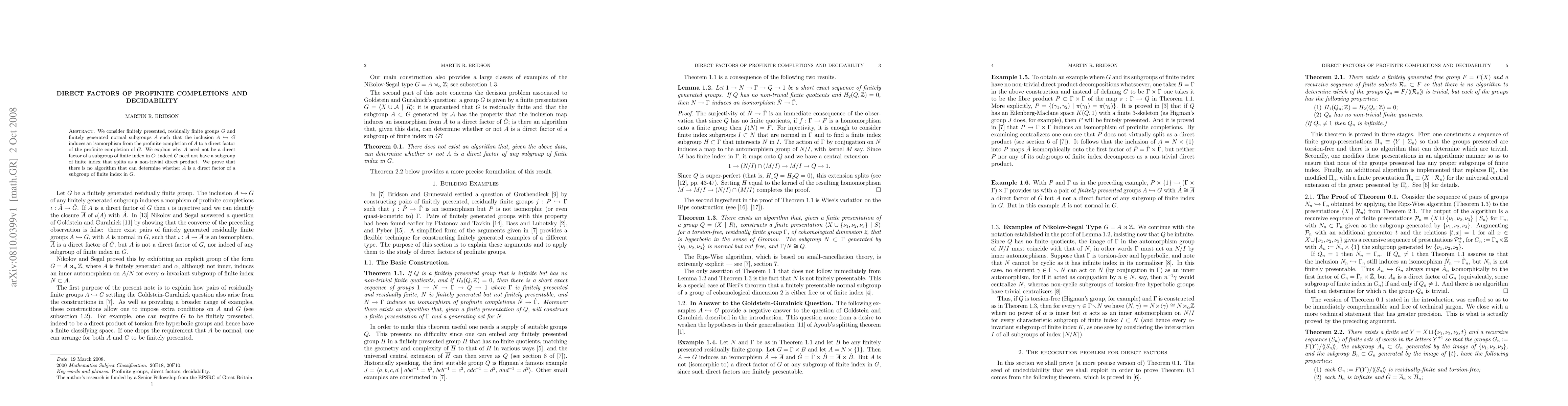 We consider finitely presented,residually finite groups $G$ and finitely generated normal subgroups $A$ such that the inclusion $A\hookrightarrow G$ induces an isomorphism from the profinite completion of $A$ to a direct factor of the profinite completion of $G$. We explain why $A$ need not be a direct factor of a subgroup of finite index in $G$; indeed $G$ need not have a subgroup of finite index that splits as a non-trivial direct product. We prove that there is no algorithm that can determine whether $A$ is a direct factor of a subgroup of finite index in $G$.