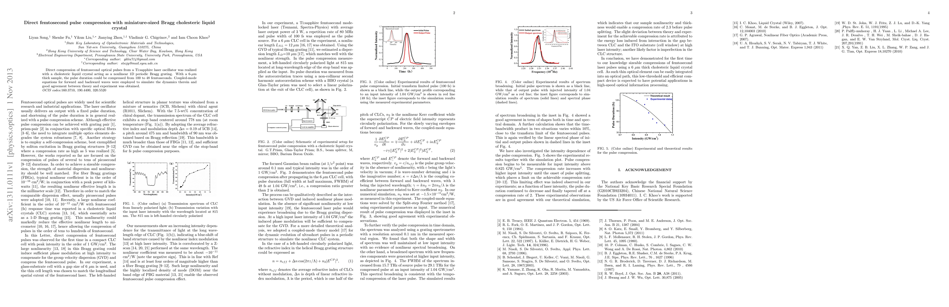 This paper demonstrates direct femtosecond pulse compression using a miniature cholesteric liquid crystal as a nonlinear Bragg grating, achieving a reduction in pulse duration from 100 to 48 femtoseconds. Theoretical simulations using coupled-mode equations matched experimental results.