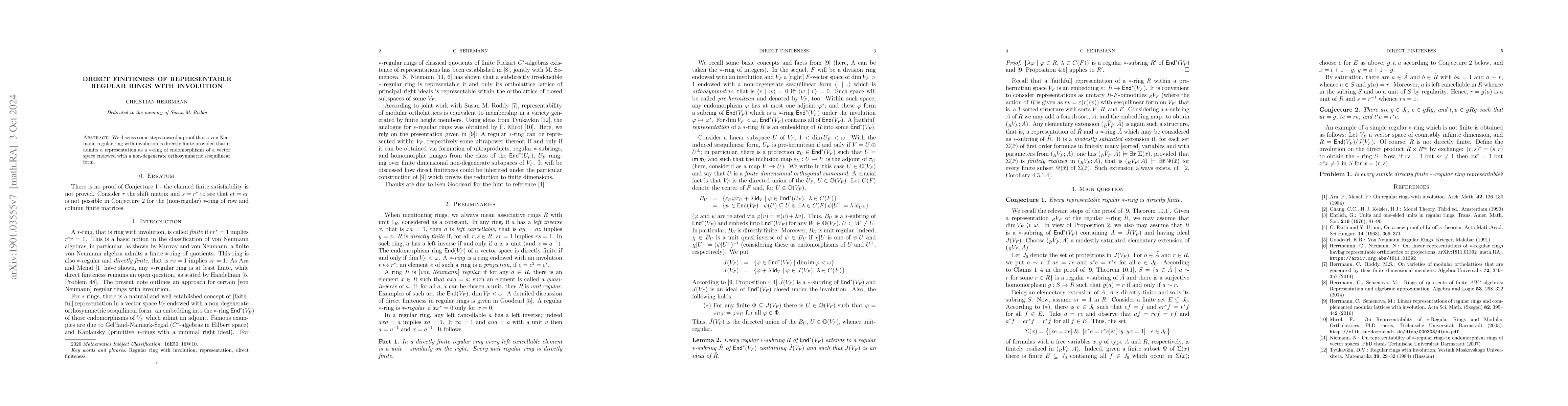 We show that a von Neumann regular ring with involution is directly finite provided that it admits a representation as a ring of endomorphisms (the involution given by taking adjoints) of a vector space endowed with a non-degenerate orthosymmetric sesquilinear form.