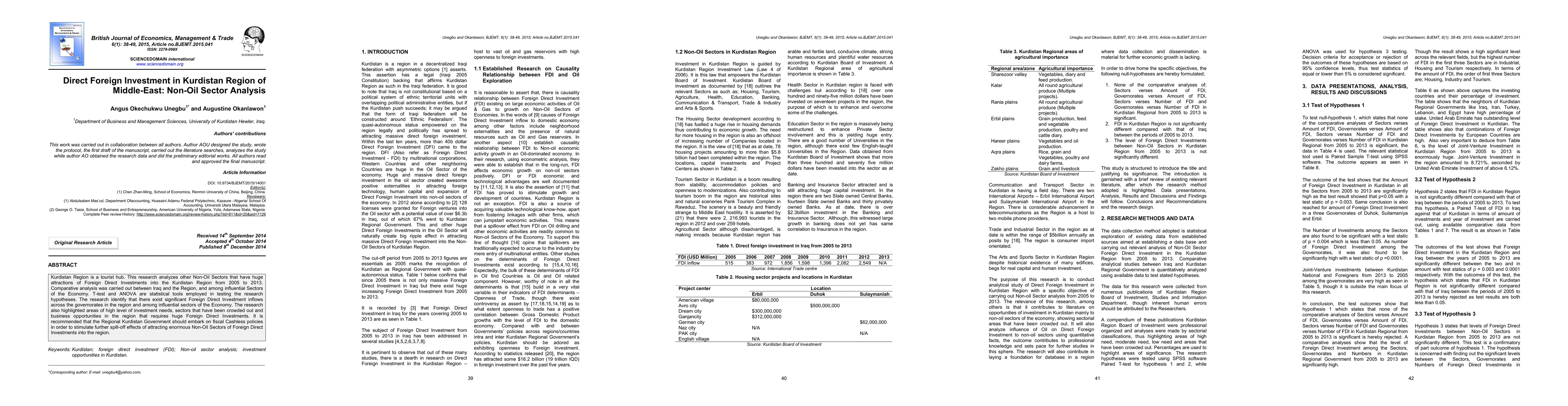 Kurdistan Region is a tourist hub. This research analyzes other Non-Oil Sectors that have huge attractions of Foreign Direct Investments into the Kurdistan Region from 2005 to 2013. Comparative analysis was carried out between Iraq and the Region, and among influential Sectors of the Economy. T-test and ANOVA are statistical tools employed in testing the research hypotheses. The research identify that there exist significant Foreign Direct Investment inflows across the governorates in the region and among influential sectors of the Economy. The research also highlighted areas of high level of investment needs, sectors that have been crowded out and business opportunities in the region that requires huge Foreign Direct Investments. It is recommended that the Regional Kurdistan Government should embark on fiscal Cashless policies in order to stimulate further spill-off effects of attracting enormous Non-Oil Sectors of Foreign Direct Investments into the region.