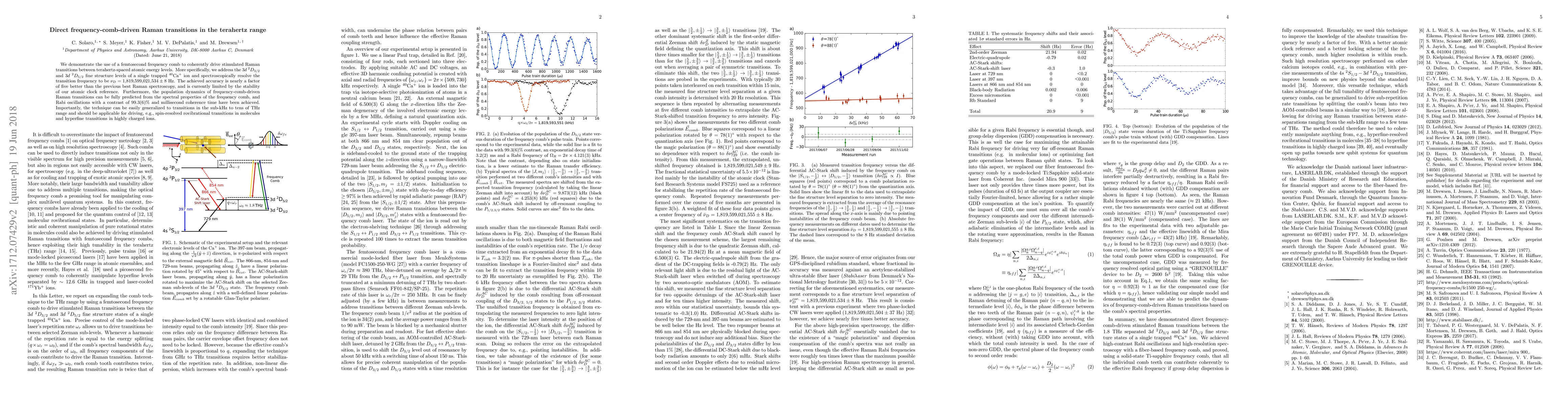 We demonstrate the use of a femtosecond frequency comb to coherently drive stimulated Raman transitions between terahertz-spaced atomic energy levels. More specifically, we address the $3d~^2D_{3/2}$ and $3d~^2D_{5/2}$ fine structure levels of a single trapped $^{40}$Ca$^+$ ion and spectroscopically resolve the transition frequency to be $\nu_D = 1{,}819{,}599{,}021{,}534 \pm 8$ Hz. The achieved accuracy is nearly a factor of five better than the previous best Raman spectroscopy, and is currently limited by the stability of our atomic clock reference. Furthermore, the population dynamics of frequency-comb-driven Raman transitions can be fully predicted from the spectral properties of the frequency comb, and Rabi oscillations with a contrast of 99.3(6)\% and millisecond coherence time has been achieved. Importantly, the technique can be easily generalized to transitions in the sub-kHz to tens of THz range and should be applicable for driving, e.g., spin-resolved rovibrational transitions in molecules and hyperfine transitions in highly charged ions.