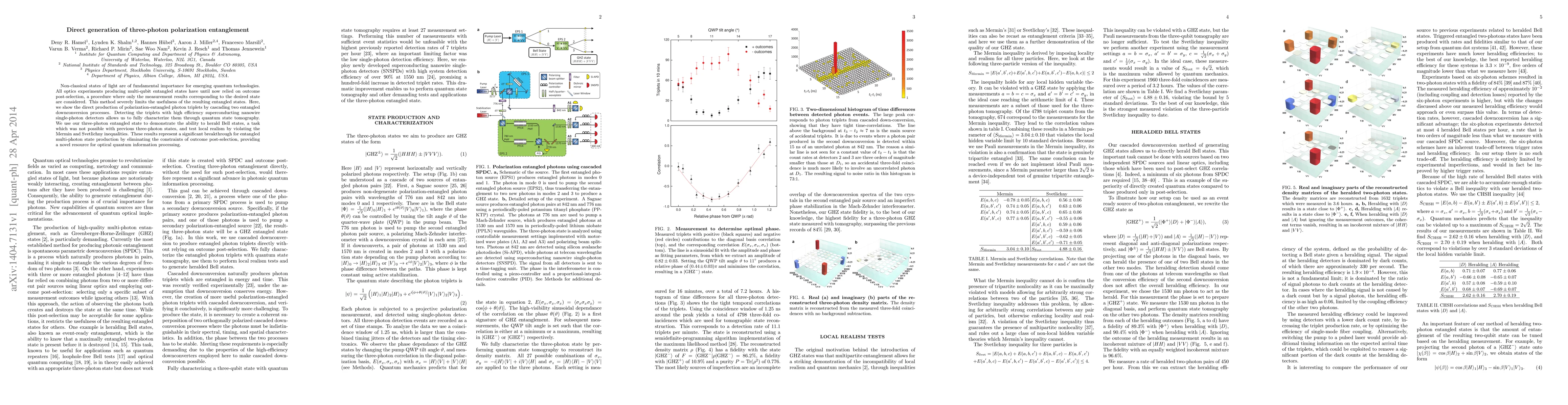 This paper demonstrates the direct generation of three-photon polarization entanglement without outcome post-selection, using cascading entangled downconversion processes. The high-efficiency detection and characterization via quantum state tomography enable the heralding of Bell states and violation of Mermin and Svetlichny inequalities, marking a significant advancement in multi-photon entangled state production for quantum technologies.