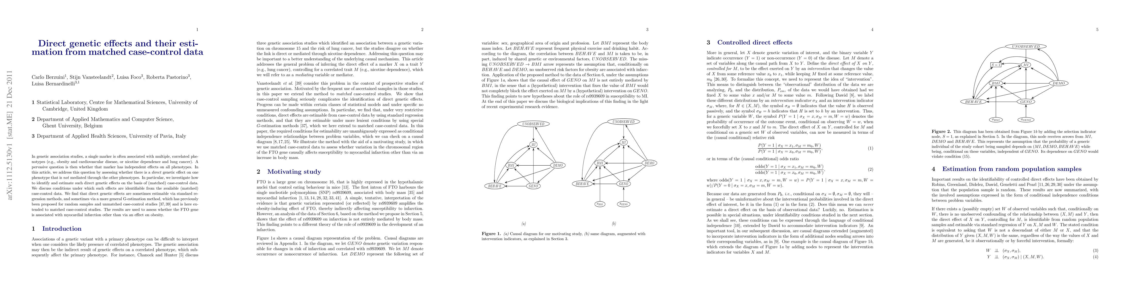 This paper explores the identification and estimation of direct genetic effects on specific phenotypes in genetic association studies, particularly using matched case-control data. It extends G-estimation methods to assess whether genetic markers like the FTO gene influence myocardial infarction independently of their effects on obesity.