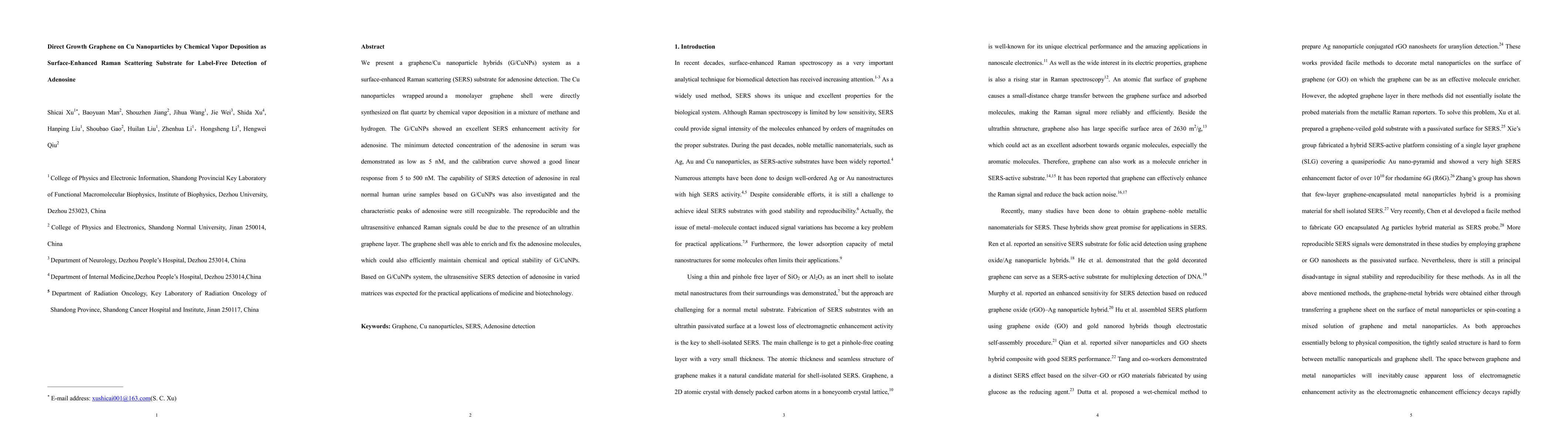 This paper reports the synthesis of graphene/Cu nanoparticle hybrids (G/CuNPs) via chemical vapor deposition for use as a surface-enhanced Raman scattering (SERS) substrate. The G/CuNPs demonstrated ultrasensitive detection of adenosine in serum and urine samples, with a minimum detectable concentration of 5 nM, highlighting potential applications in medical and biotechnological fields.
