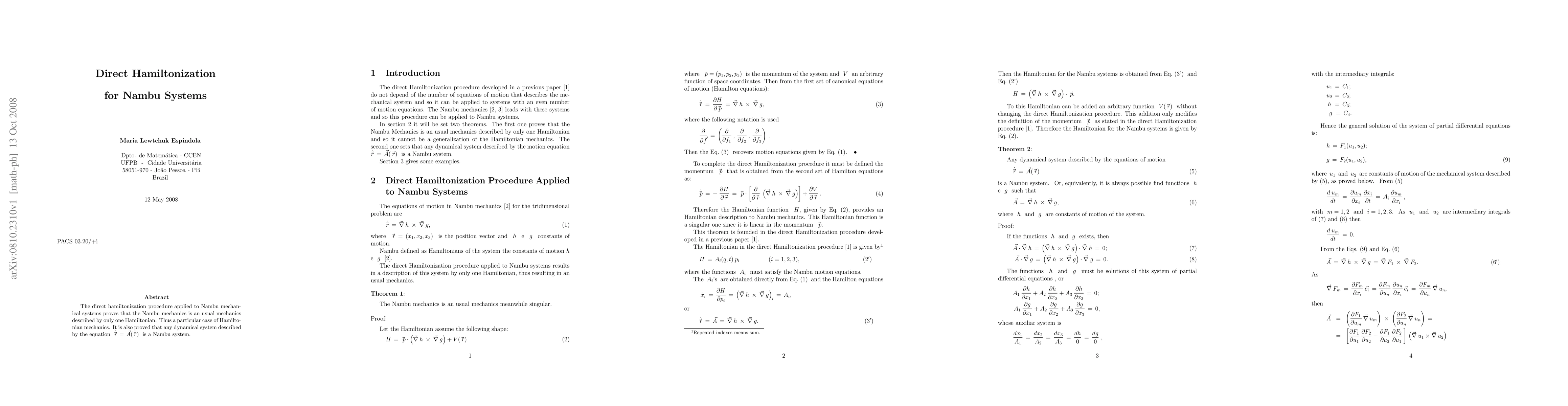 The direct hamiltonization procedure applied to Nambu mechanical systems proves that the Nambu mechanics is an usual mechanics described by only one Hamiltonian. Thus a particular case of Hamiltonian mechanics. It is also proved that any mechanical system described by the equation d{\bf r}/dt={\bf A(r)} is a Nambu system.