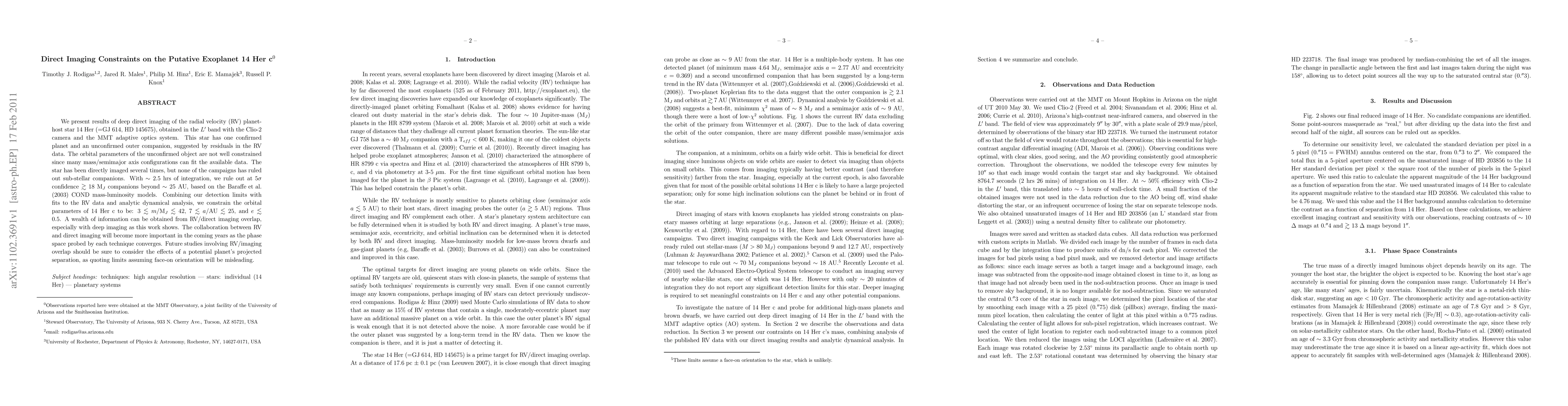 We present results of deep direct imaging of the radial velocity (RV) planet-host star 14 Her (=GJ 614, HD 145675), obtained in the \lprime ~band with the Clio-2 camera and the MMT adaptive optics system. This star has one confirmed planet and an unconfirmed outer companion, suggested by residuals in the RV data. The orbital parameters of the unconfirmed object are not well constrained since many mass/semimajor axis configurations can fit the available data. The star has been directly imaged several times, but none of the campaigns has ruled out sub-stellar companions. With \about 2.5 hrs of integration, we rule out at 5$\sigma$ confidence $\gtrsim$ 18 \mj ~companions beyond \about 25 AU, based on the \cite{baraffe} COND mass-luminosity models. Combining our detection limits with fits to the RV data and analytic dynamical analysis, we constrain the orbital parameters of 14 Her c to be: $3 \lesssim m/$\mj ~$\lesssim 42$, $7 \lesssim a/$AU $\lesssim 25$, and $e \lesssim 0.5$. A wealth of information can be obtained from RV/direct imaging overlap, especially with deep imaging as this work shows. The collaboration between RV and direct imaging will become more important in the coming years as the phase space probed by each technique converges. Future studies involving RV/imaging overlap should be sure to consider the effects of a potential planet's projected separation, as quoting limits assuming face-on orientation will be misleading.
