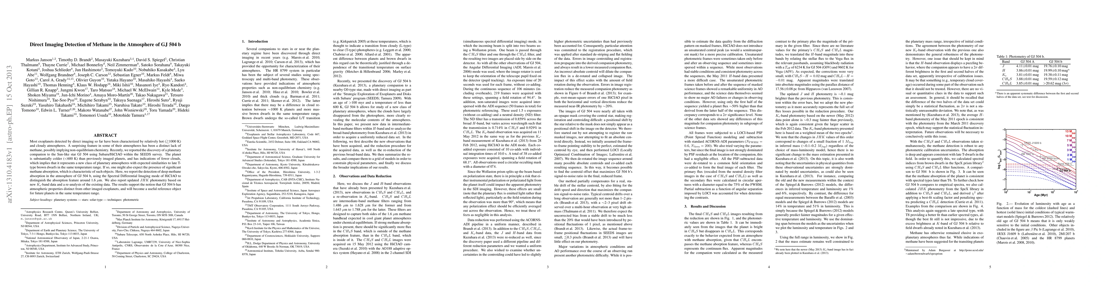 This paper reports the detection of methane absorption in the atmosphere of GJ 504 b, a cooler (<600 K) directly imaged exoplanet, using Subaru/HiCIAO. The findings suggest GJ 504 b's atmosphere is distinct from others, with significant methane presence, indicating it may represent a new class of planetary atmospheres.