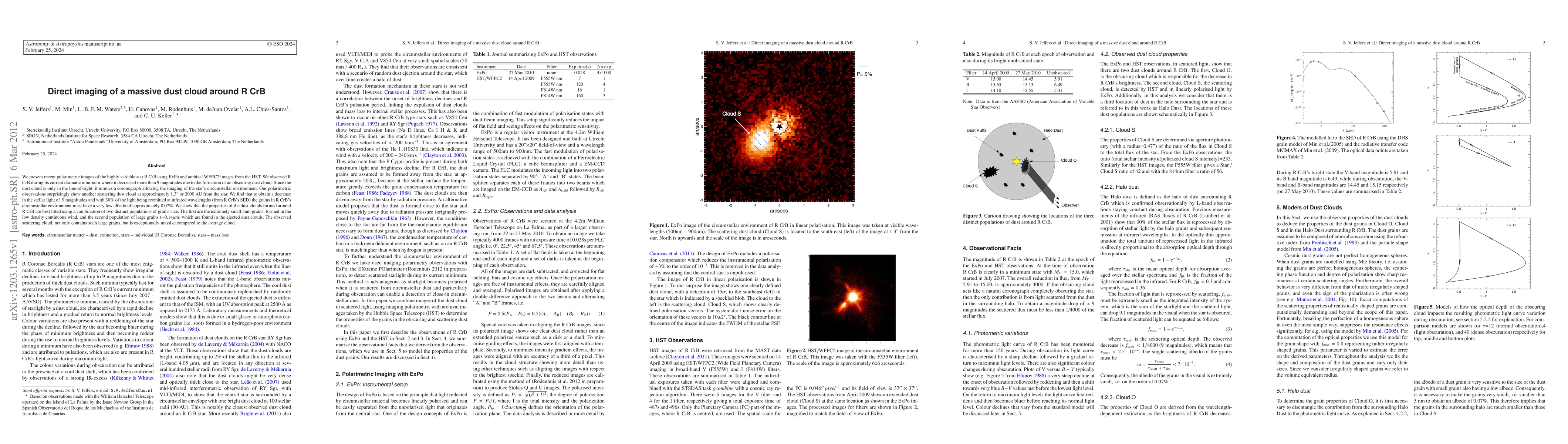 We present recent polarimetric images of the highly variable star R CrB using ExPo and archival WFPC2 images from the HST. We observed R CrB during its current dramatic minimum where it decreased more than 9 mag due to the formation of an obscuring dust cloud. Since the dust cloud is only in the line-of-sight, it mimics a coronograph allowing the imaging of the star's circumstellar environment. Our polarimetric observations surprisingly show another scattering dust cloud at approximately 1.3" or 2000 AU from the star. We find that to obtain a decrease in the stellar light of 9 mag and with 30% of the light being reemitted at infrared wavelengths (from R CrB's SED) the grains in R CrB's circumstellar environment must have a very low albedo of approximately 0.07%. We show that the properties of the dust clouds formed around R CrB are best fitted using a combination of two distinct populations of grains size. The first are the extremely small 5 nm grains, formed in the low density continuous wind, and the second population of large grains (~0.14 {\mu}m) which are found in the ejected dust clouds. The observed scattering cloud, not only contains such large grains, but is exceptionally massive compared to the average cloud.