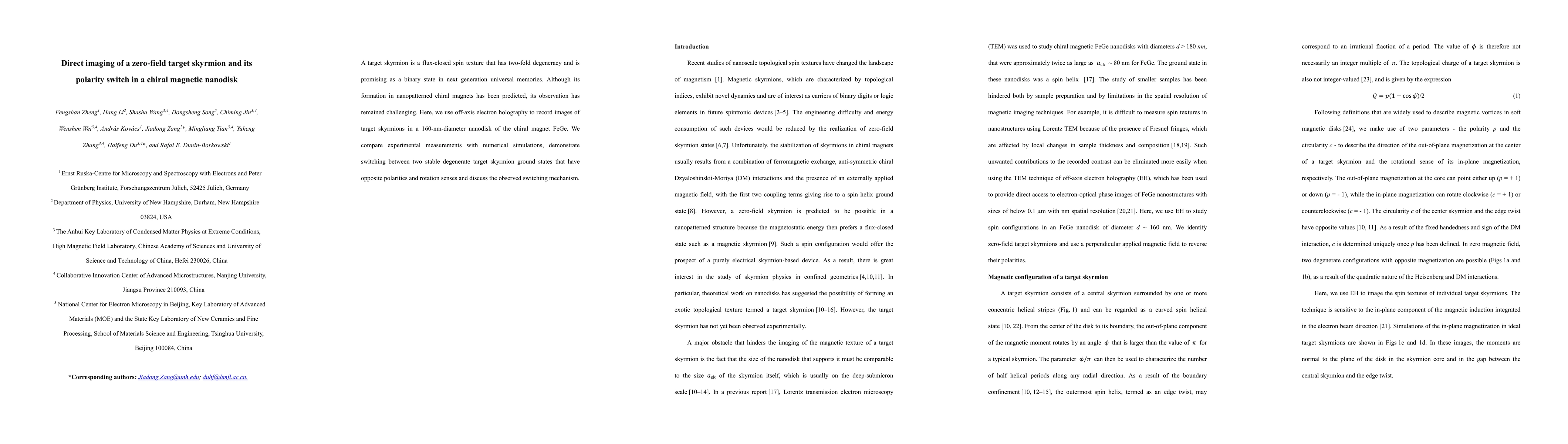This paper reports the direct imaging of target skyrmions in a chiral magnetic nanodisk using off-axis electron holography, demonstrating their formation and switching between two oppositely polar degenerate states. The findings are supported by numerical simulations and provide insights into the switching mechanism.