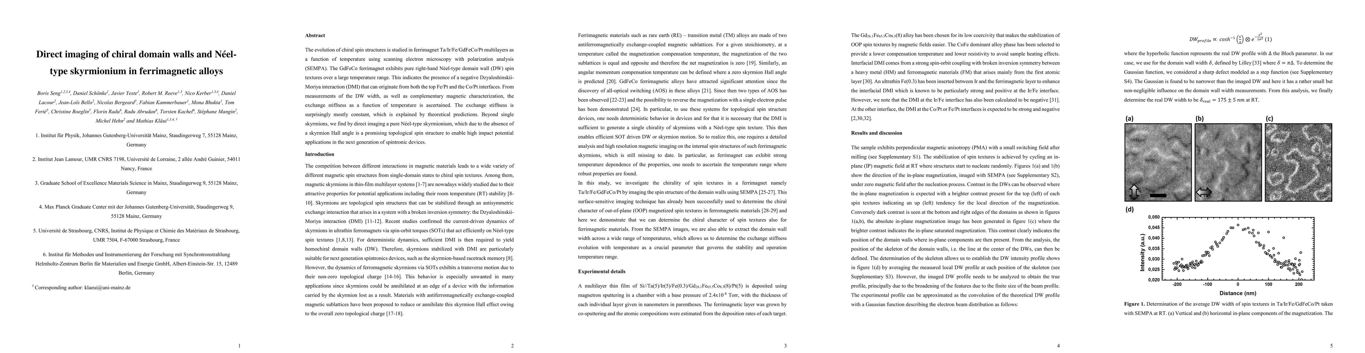 The evolution of chiral spin structures is studied in ferrimagnet Ta/Ir/Fe/GdFeCo/Pt multilayers as a function of temperature using scanning electron microscopy with polarization analysis (SEMPA). The GdFeCo ferrimagnet exhibits pure right-hand N\'eel-type domain wall (DW) spin textures over a large temperature range. This indicates the presence of a negative Dzyaloshinskii-Moriya interaction (DMI) that can originate from both the top Fe/Pt and the Co/Pt interfaces. From measurements of the DW width, as well as complementary magnetic characterization, the exchange stiffness as a function of temperature is ascertained. The exchange stiffness is surprisingly mostly constant, which is explained by theoretical predictions. Beyond single skyrmions, we find by direct imaging a pure N\'eel-type skyrmionium, which due to the absence of a skyrmion Hall angle is a promising topological spin structure to enable high impact potential applications in the next generation of spintronic devices.