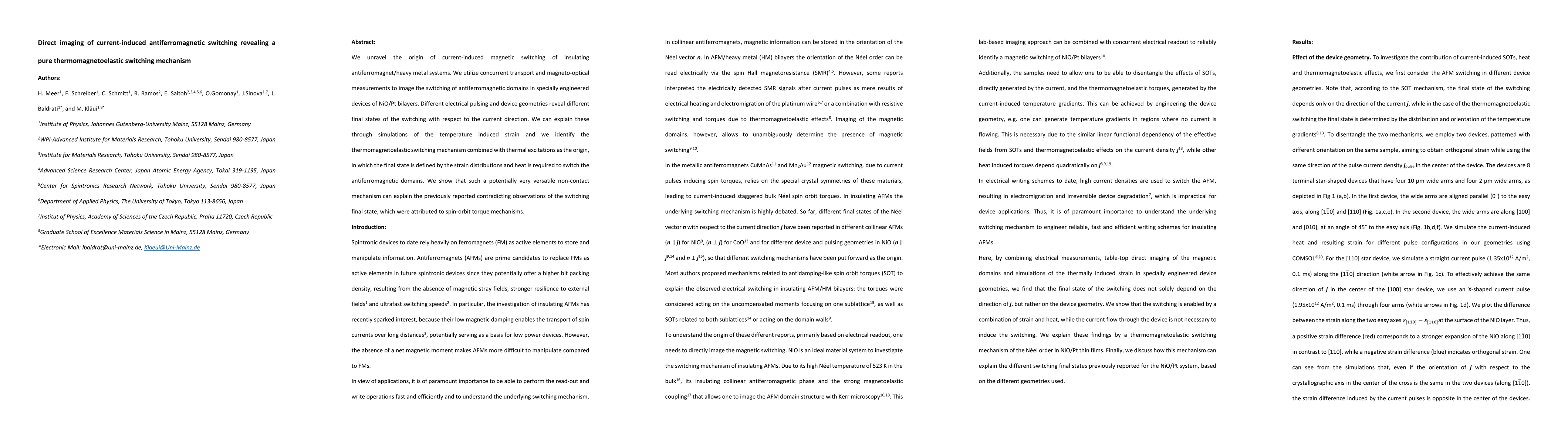 This paper demonstrates current-induced switching of antiferromagnetic domains in NiO/Pt bilayers using transport and magneto-optical imaging, identifying a thermomagnetoelastic mechanism involving temperature-induced strain and thermal excitations rather than spin-orbit torque. The findings unify conflicting observations regarding switching final states.