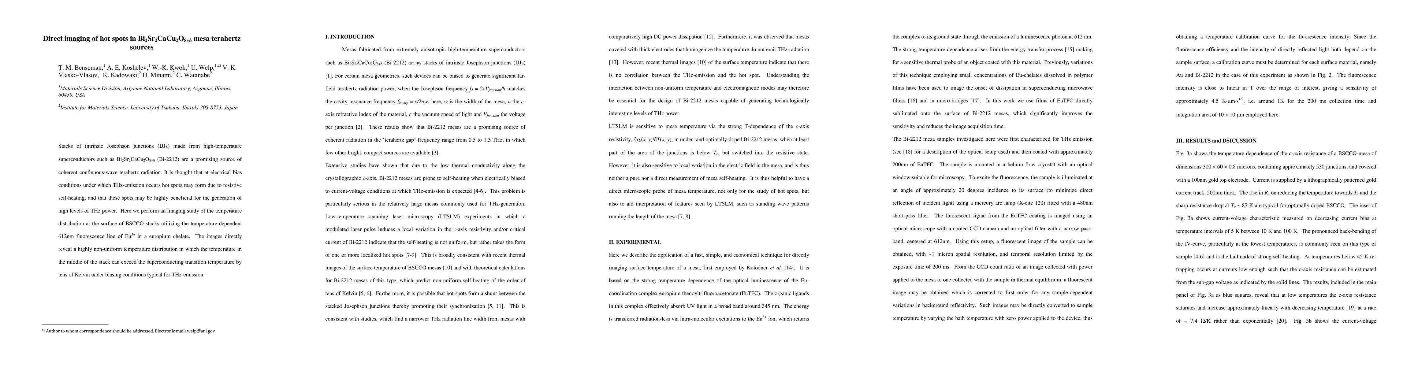 Stacks of intrinsic Josephson junctions (IJJs) made from high-temperature superconductors such as Bi_{2}Sr_{2}CaCu_{2}O_{8+\delta} (Bi-2212) are a promising source of coherent continuous-wave terahertz radiation. It is thought that at electrical bias conditions under which THz-emission occurs hot spots may form due to resistive self-heating, and that these spots may be highly beneficial for the generation of high levels of THz power. Here we perform an imaging study of the temperature distribution at the surface of BSCCO stacks utilizing the temperature-dependent 612nm fluorescence line of Eu^{3+} in a europium chelate. The images directly reveal a highly non-uniform temperature distribution in which the temperature in the middle of the stack can exceed the superconducting transition temperature by tens of Kelvin under biasing conditions typical for THz-emission.