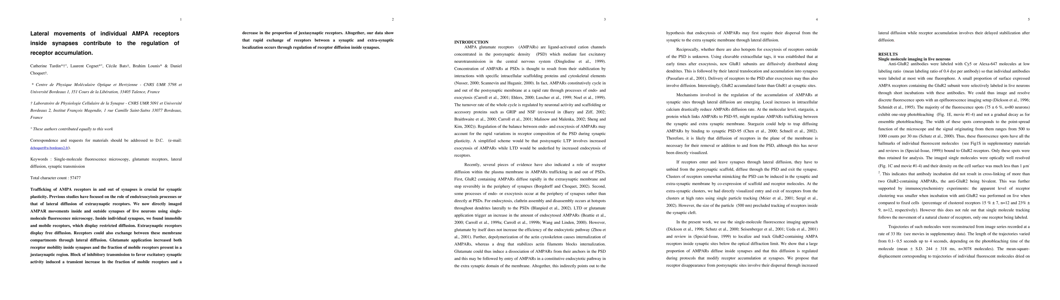 Trafficking of AMPA receptors in and out of synapses is crucial for synaptic plasticity. Previous studies have focused on the role of endo/exocytosis processes or that of lateral diffusion of extra-synaptic receptors. We have now directly imaged AMPAR movements inside and outside synapses of live neurons using single-molecule fluorescence microscopy. Inside individual synapses, we found immobile and mobile receptors, which display restricted diffusion. Extra-synaptic receptors display free diffusion. Receptors could also exchange between these membrane compartments through lateral diffusion. Glutamate application increased both receptor mobility inside synapses and the fraction of mobile receptors present in a juxtasynaptic region. Block of inhibitory transmission to favor excitatory synaptic activity induced a transient increase in the fraction of mobile receptors and a decrease in the proportion of juxtasynaptic receptors. Altogether, our data show that rapid exchange of receptors between a synaptic and extra-synaptic localization occurs through regulation of receptor diffusion inside synapses.