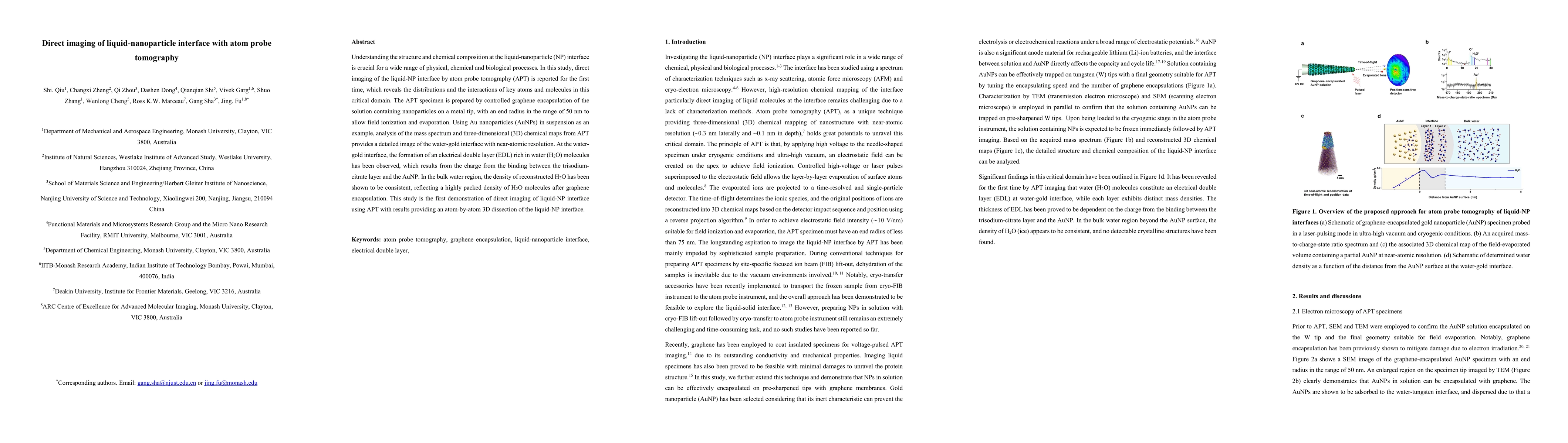 This study reports the first direct imaging of the liquid-nanoparticle interface using atom probe tomography (APT), revealing atomic distributions and interactions at the water-gold nanoparticle interface with near-atomic resolution. The study observes the formation of an electrical double layer rich in water molecules at the interface, providing a detailed 3D chemical map of the liquid-nanoparticle interaction.