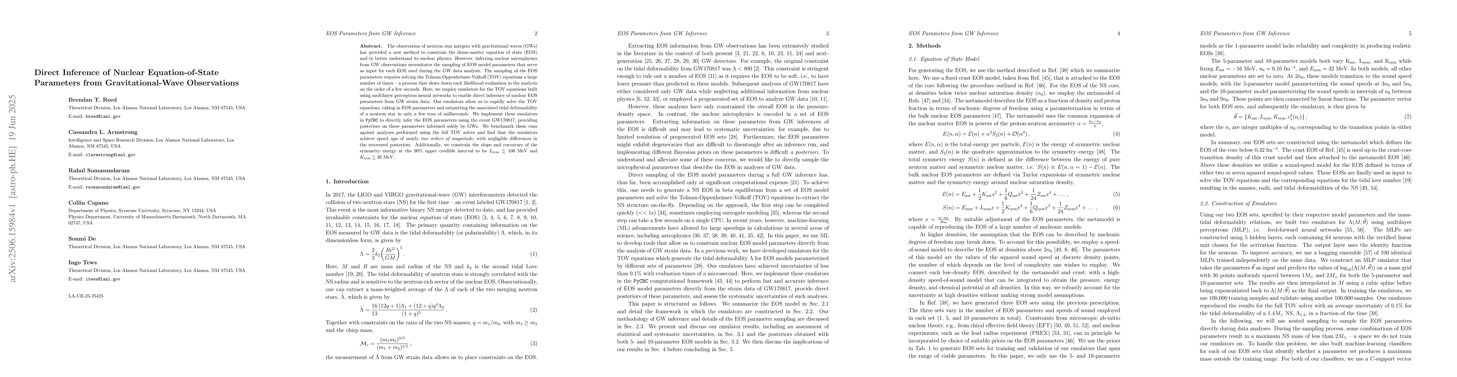 The observation of neutron star mergers with gravitational waves (GWs) has provided a new method to constrain the dense-matter equation of state (EOS) and to better understand its nuclear physics. However, inferring nuclear microphysics from GW observations necessitates the sampling of EOS model parameters that serve as input for each EOS used during the GW data analysis. The sampling of the EOS parameters requires solving the Tolman-Oppenheimer-Volkoff (TOV) equations a large number of times -- a process that slows down each likelihood evaluation in the analysis on the order of a few seconds. Here, we employ emulators for the TOV equations built using multilayer perceptron neural networks to enable direct inference of nuclear EOS parameters from GW strain data. Our emulators allow us to rapidly solve the TOV equations, taking in EOS parameters and outputting the associated tidal deformability of a neutron star in only a few tens of milliseconds. We implement these emulators in \texttt{PyCBC} to directly infer the EOS parameters using the event GW170817, providing posteriors on these parameters informed solely by GWs. We benchmark these runs against analyses performed using the full TOV solver and find that the emulators achieve speed ups of nearly \emph{two orders of magnitude}, with negligible differences in the recovered posteriors. Additionally, we constrain the slope and curvature of the symmetry energy at the 90\% upper credible interval to be $L_{\rm sym}\lesssim106$ MeV and $K_{\rm sym}\lesssim26$ MeV.