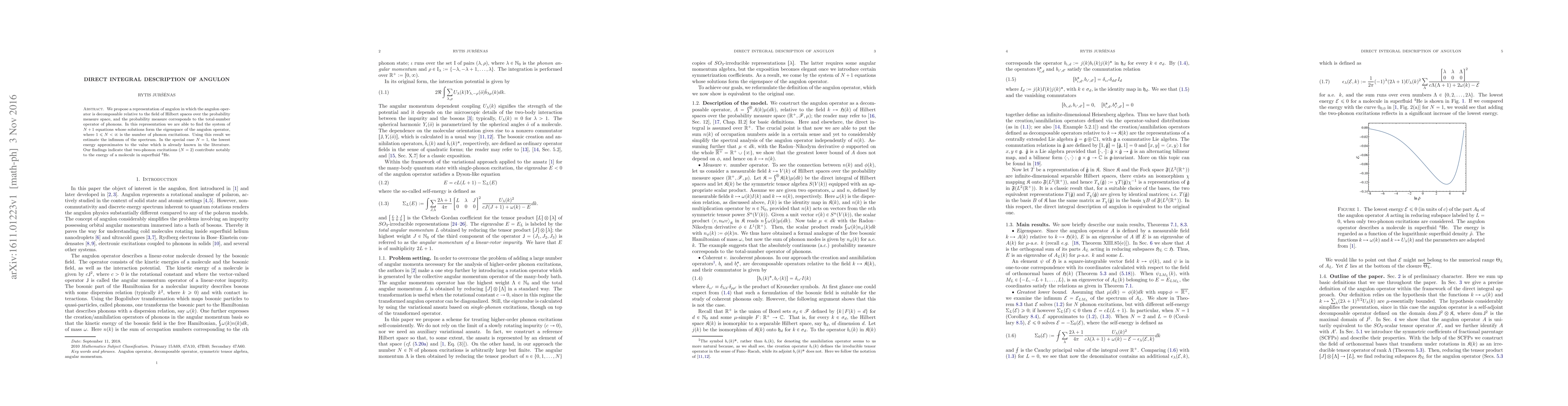 We propose a representation of angulon in which the angulon operator is decomposable relative to the field of Hilbert spaces over the probability measure space, and the probability measure corresponds to the total-number operator of phonons. In this representation we are able to find the system of $N+1$ equations whose solutions form the eigenspace of the angulon operator, where $1\leq N<\infty$ is the number of phonon excitations. Using this result we estimate the infimum of the spectrum. In the special case $N=1$, the lowest energy approximates to the value which is already known in the literature. Our findings indicate that two-phonon excitations ($N=2$) contribute notably to the energy of a molecule in superfluid $^4$He.