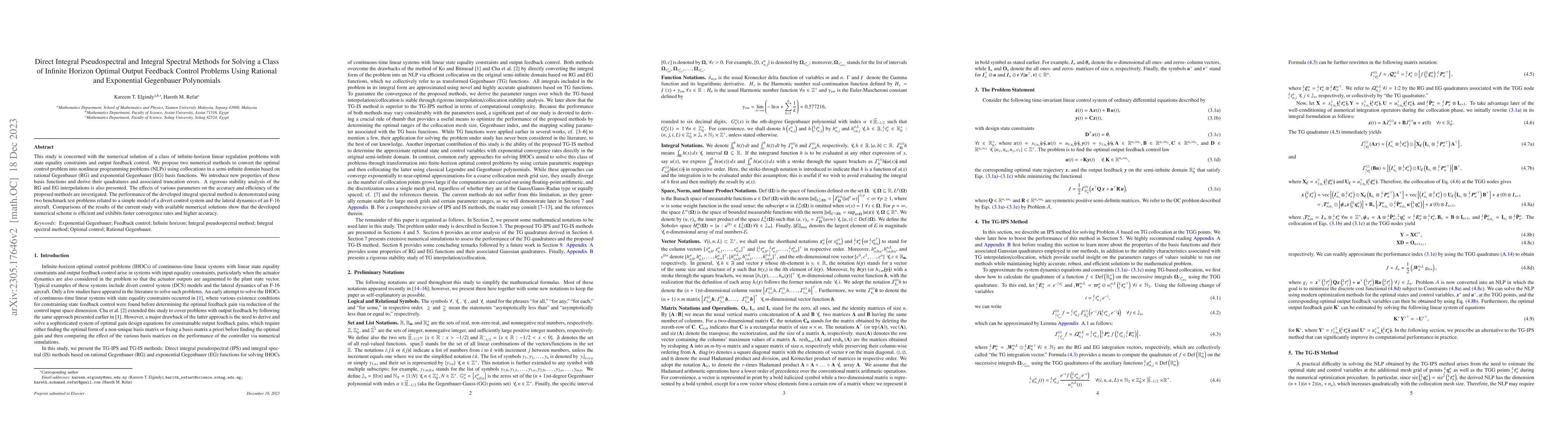 This study is concerned with the numerical solution of a class of infinite-horizon linear regulation problems with state equality constraints and output feedback control. We propose two numerical methods to convert the optimal control problem into nonlinear programming problems (NLPs) using collocations in a semi-infinite domain based on rational Gegenbauer (RG) and exponential Gegenbauer (EG) basis functions. We introduce new properties of these basis functions and derive their quadratures and associated truncation errors. A rigorous stability analysis of the RG and EG interpolations is also presented. The effects of various parameters on the accuracy and efficiency of the proposed methods are investigated. The performance of the developed integral spectral method is demonstrated using two benchmark test problems related to a simple model of a divert control system and the lateral dynamics of an F-16 aircraft. Comparisons of the results of the current study with available numerical solutions show that the developed numerical scheme is efficient and exhibits faster convergence rates and higher accuracy.