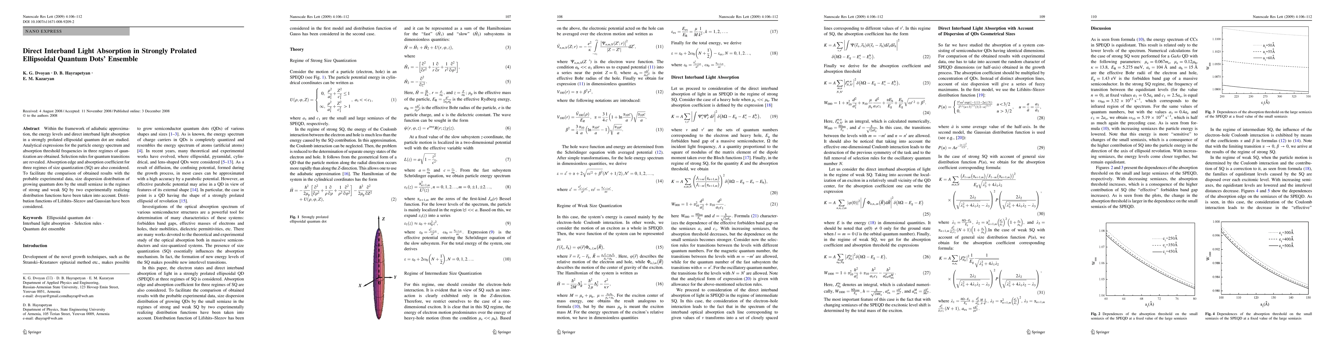 This paper studies the energy levels and direct interband light absorption in strongly prolated ellipsoidal quantum dots using adiabatic approximation, deriving analytical expressions for particle energy spectrum and absorption thresholds across three quantization regimes. It also considers size dispersion distribution functions for comparison with experimental data.