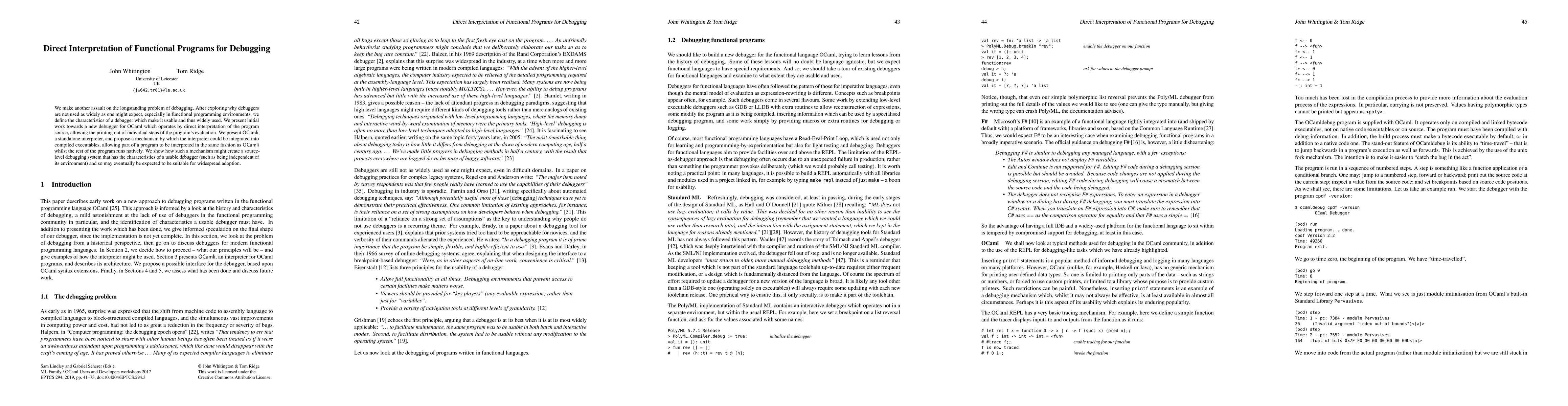 This paper proposes a novel debugger for OCaml that directly interprets functional programs, enabling step-by-step evaluation and debugging. It introduces OCamli, a standalone interpreter, and suggests integrating it into compiled executables to provide a source-level debugging system with desirable usability characteristics.