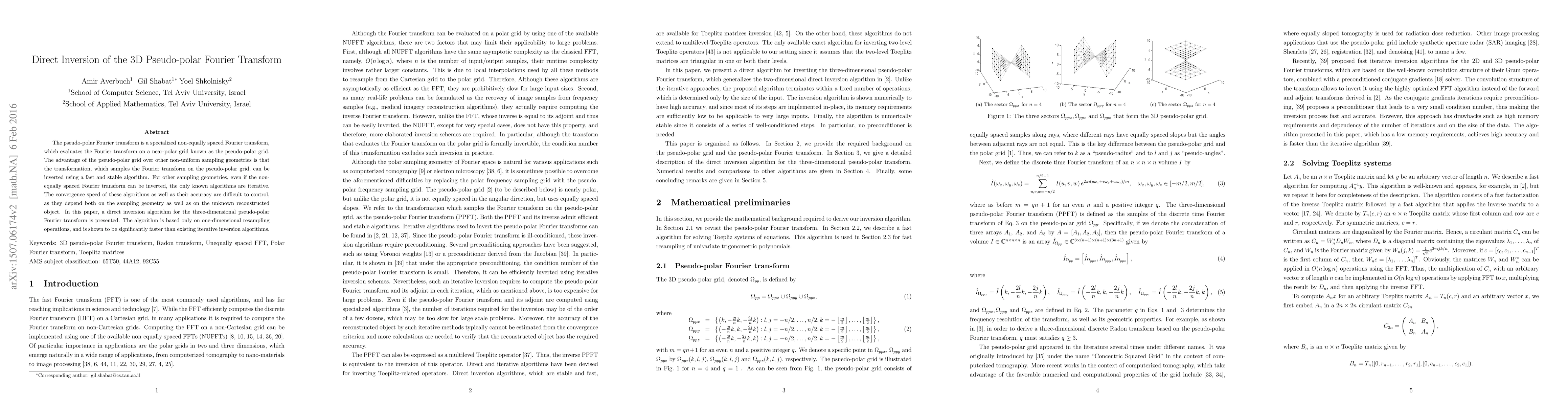 This paper presents a direct inversion algorithm for the 3D pseudo-polar Fourier transform, which is faster and more stable than existing iterative methods. The algorithm utilizes one-dimensional resampling operations, offering significant improvements in speed and accuracy.