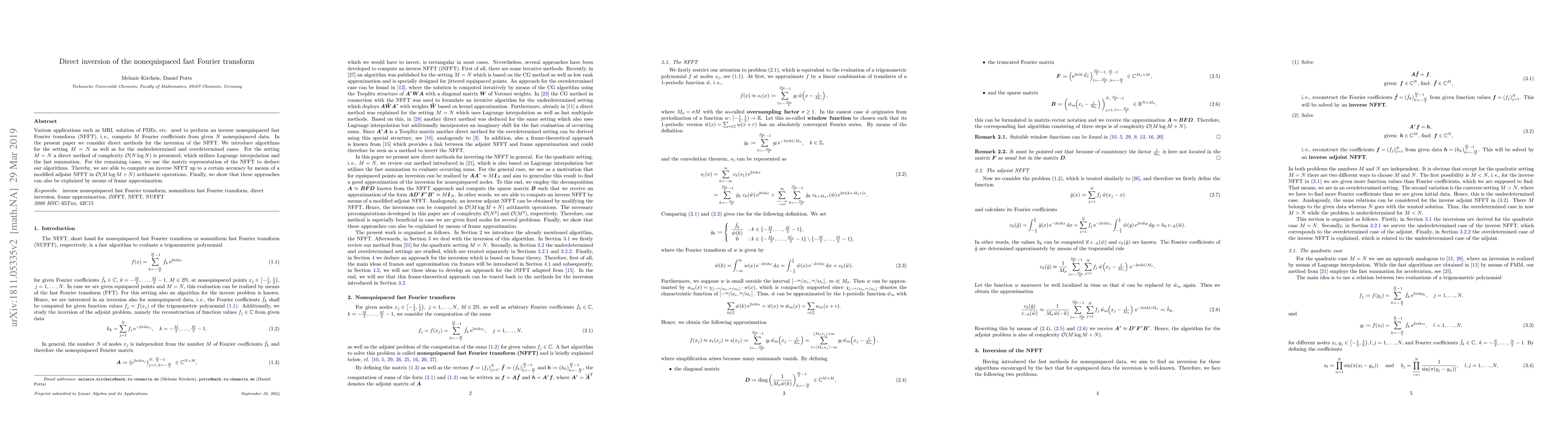The paper presents direct methods for inverting the nonequispaced fast Fourier transform (NFFT), introducing algorithms for M = N, underdetermined, and overdetermined cases. Lagrange interpolation and fast summation are utilized for the M = N case, achieving O(N log N) complexity. For other cases, matrix representations of the NFFT are employed to compute an inverse NFFT up to a certain accuracy using a modified adjoint NFFT in O(M log M + N) arithmetic operations. The approaches are also explained through frame approximation.