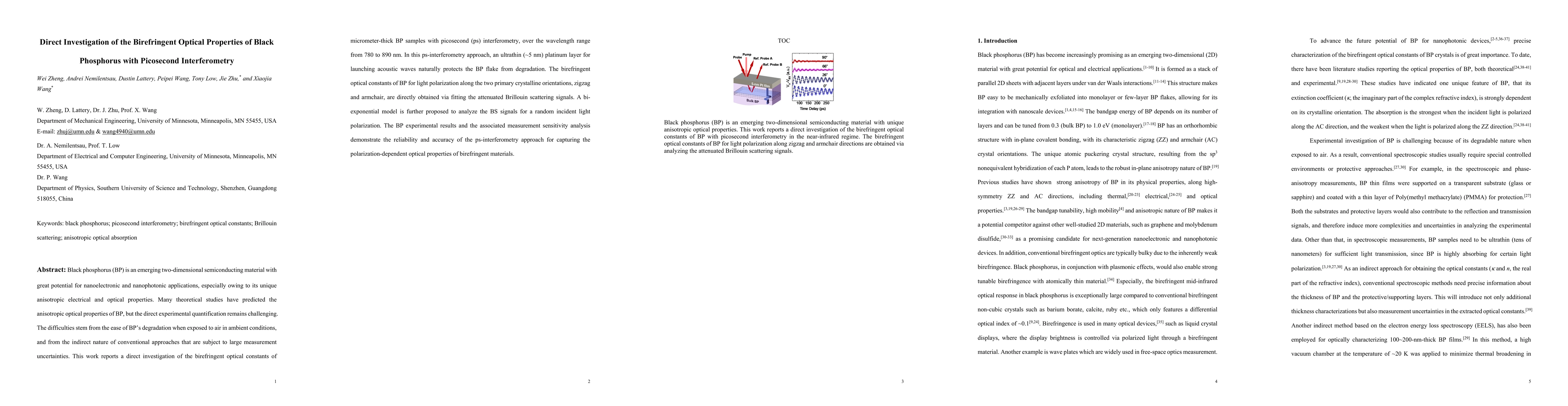 Black phosphorus (BP) is an emerging two-dimensional semiconducting material with great potential for nanoelectronic and nanophotonic applications, especially owing to its unique anisotropic electrical and optical properties. Many theoretical studies have predicted the anisotropic optical properties of BP, but the direct experimental quantification remains challenging. The difficulties stem from the ease of BP's degradation when exposed to air in ambient conditions, and from the indirect nature of conventional approaches that are subject to large measurement uncertainties. This work reports a direct investigation of the birefringent optical constants of micrometer-thick BP samples with picosecond (ps) interferometry, over the wavelength range from 780 to 890 nm. In this ps-interferometry approach, an ultrathin (5 nm) platinum layer for launching acoustic waves naturally protects the BP flake from degradation. The birefringent optical constants of BP for light polarization along the two primary crystalline orientations, zigzag and armchair, are directly obtained via fitting the attenuated Brillouin scattering signals. A bi-exponential model is further proposed to analyze the BS signals for a random incident light polarization. The BP experimental results and the associated measurement sensitivity analysis demonstrate the reliability and accuracy of the ps-interferometry approach for capturing the polarization-dependent optical properties of birefringent materials.