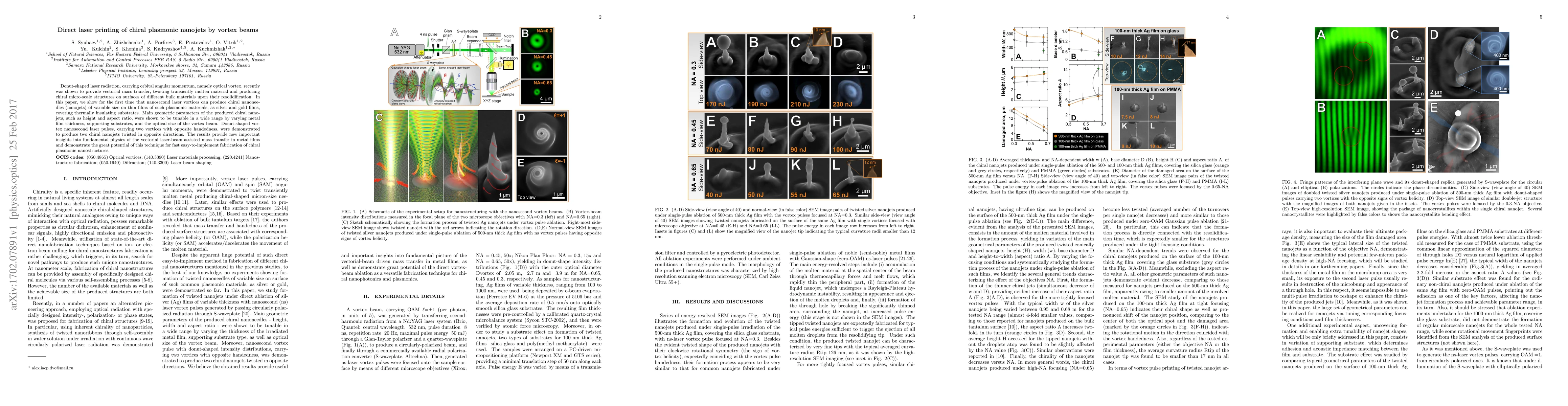 Donut-shaped laser radiation, carrying orbital angular momentum, namely optical vortex, recently was shown to provide vectorial mass transfer, twisting transiently molten material and producing chiral micro-scale structures on surfaces of different bulk materials upon their resolidification. In this paper, we show for the first time that nanosecond laser vortices can produce chiral nanoneedles (nanojets) of variable size on thin films of such plasmonic materials, as silver and gold films, covering thermally insulating substrates. Main geometric parameters of the produced chiral nanojets, such as height and aspect ratio, were shown to be tunable in a wide range by varying metal film thickness, supporting substrates, and the optical size of the vortex beam. Donut-shaped vortex nanosecond laser pulses, carrying two vortices with opposite handedness, were demonstrated to produce two chiral nanojets twisted in opposite directions. The results provide new important insights into fundamental physics of the vectorial laser-beam assisted mass transfer in metal films and demonstrate the great potential of this technique for fast easy-to-implement fabrication of chiral plasmonic nanostructures.