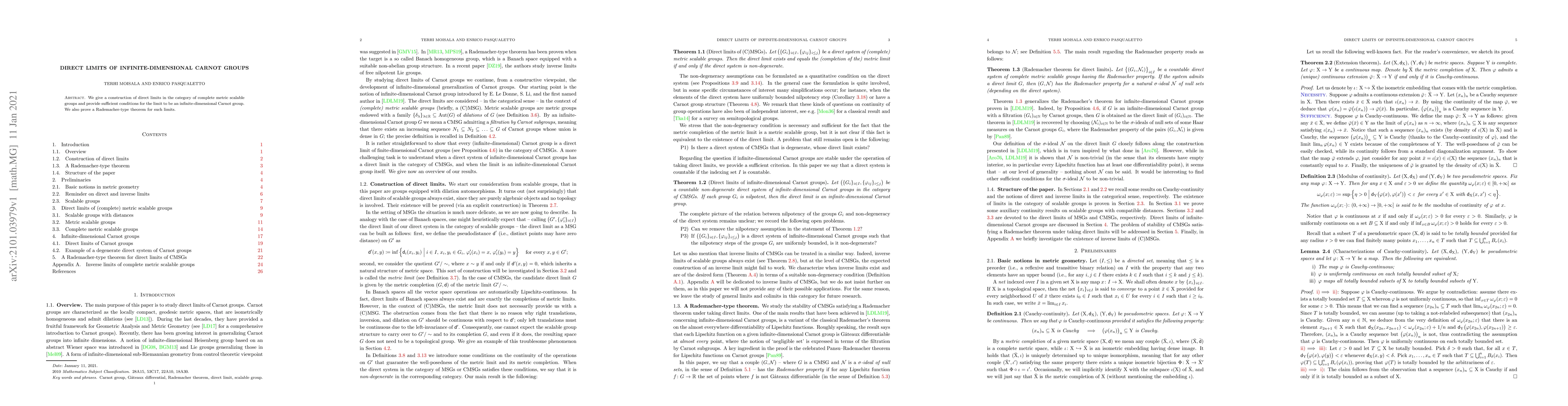 This paper constructs direct limits in the category of complete metric scalable groups and establishes conditions for these limits to be infinite-dimensional Carnot groups. Additionally, it proves a Rademacher-type theorem for these limits.