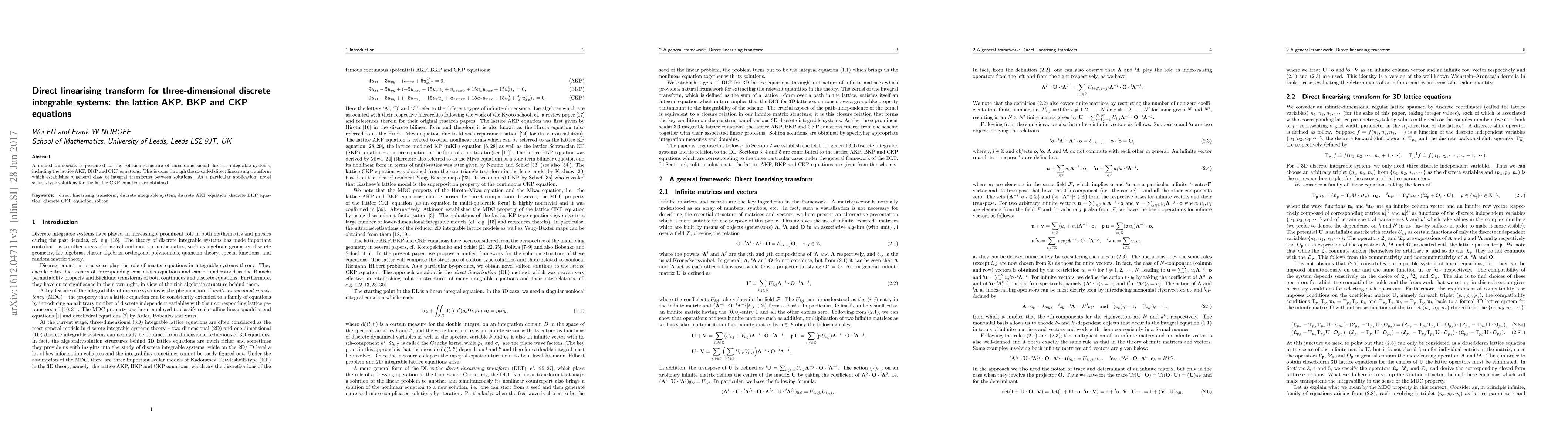 This paper introduces a direct linearising transform to unify solutions for three-dimensional discrete integrable systems, specifically the lattice AKP, BKP, and CKP equations. It also presents novel soliton-type solutions for the lattice CKP equation using this transform.