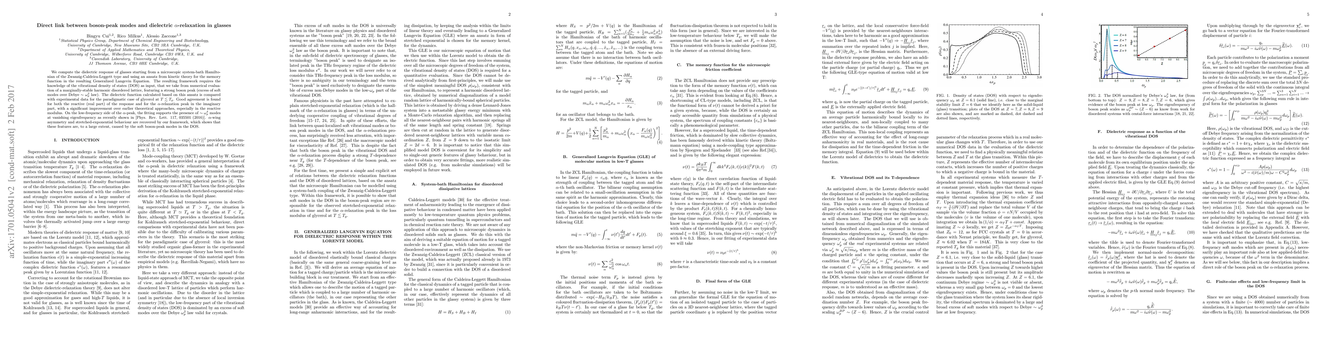 We compute the dielectric response of glasses starting from a microscopic system-bath Hamiltonian of the Zwanzig-Caldeira-Leggett type and using an ansatz from kinetic theory for the memory function in the resulting Generalized Langevin Equation. The resulting framework requires the knowledge of the vibrational density of states (DOS) as input, that we take from numerical evaluation of a marginally-stable harmonic disordered lattice, featuring a strong boson peak (excess of soft modes over Debye $\sim\omega_{p}^{2}$ law). The dielectric function calculated based on this ansatz is compared with experimental data for the paradigmatic case of glycerol at $T\lesssim T_{g}$. Good agreement is found for both the reactive (real part) of the response and for the $\alpha$-relaxation peak in the imaginary part, with a significant improvement over earlier theoretical approaches, especially in the reactive modulus. On the low-frequency side of the $\alpha$-peak, the fitting supports the presence of $\sim \omega_{p}^{4}$ modes at vanishing eigenfrequency as recently shown in [Phys. Rev. Lett. 117, 035501 (2016)]. $\alpha$-wing asymmetry and stretched-exponential behaviour are recovered by our framework, which shows that these features are, to a large extent, caused by the soft boson-peak modes in the DOS.