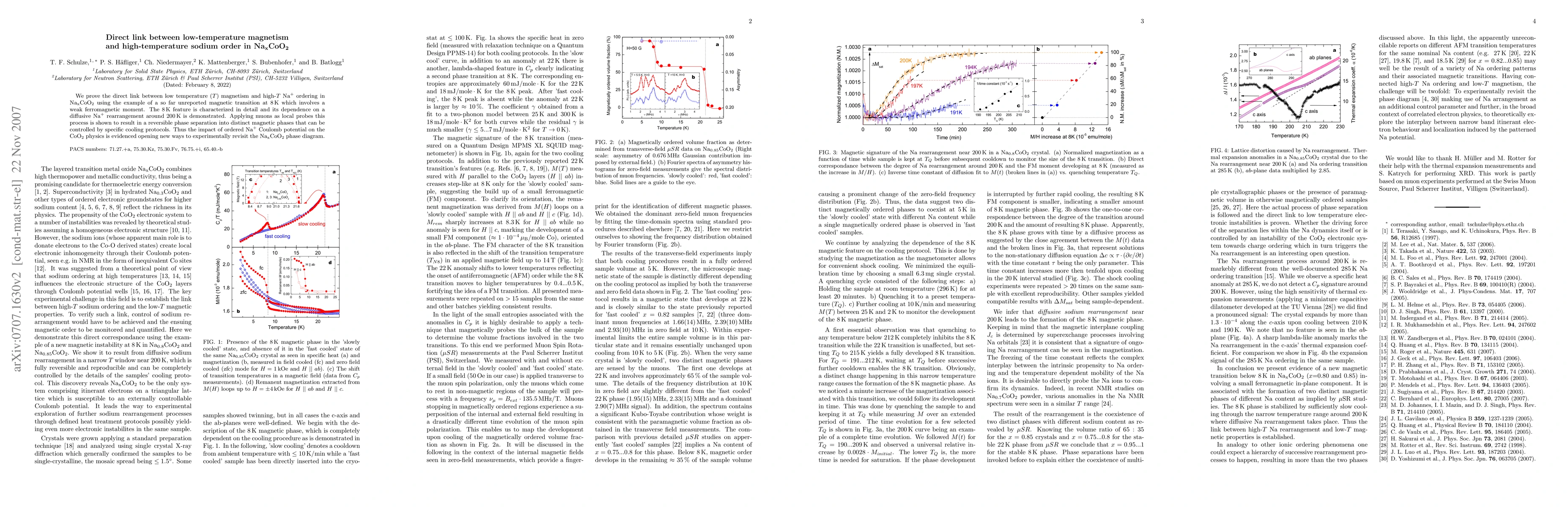 We prove the direct link between low temperature magnetism and high temperature sodium ordering in NaxCoO2 using the example of a heretofore unreported magnetic transition at 8 K which involves a weak ferromagnetic moment. The 8 K feature is characterized in detail and its dependence on a diffusive sodium rearrangement around 200 K is demonstrated. Applying muons as local probes this process is shown to result in a reversible phase separation into distinct magnetic phases that can be controlled by specific cooling protocols. Thus the impact of ordered sodium Coulomb potential on the CoO2 physics is evidenced opening new ways to experimentally revisit the NaxCoO2 phase diagram.
