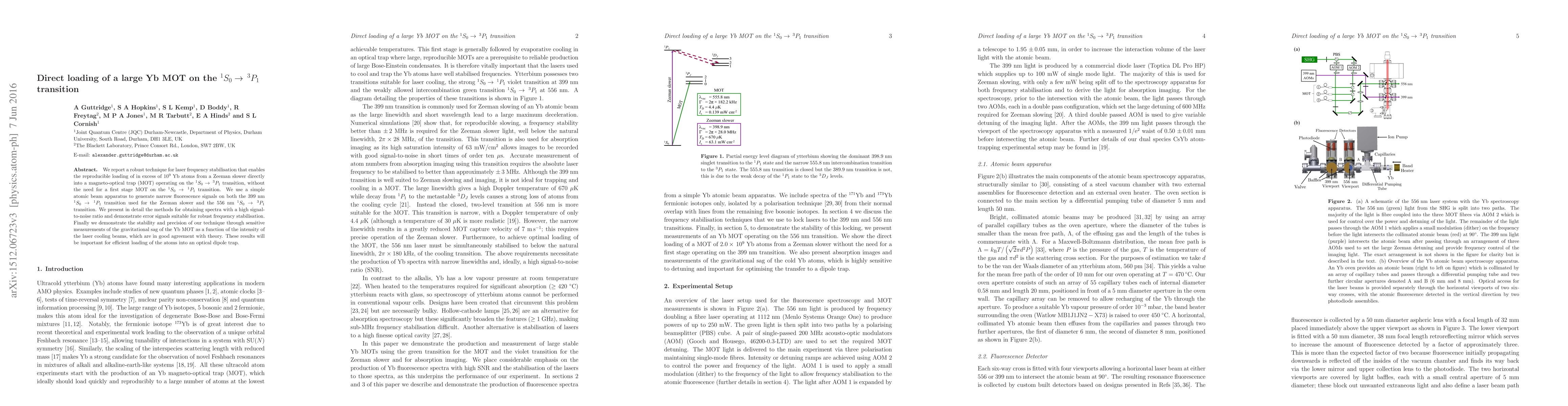 We report a robust technique for laser frequency stabilisation that enables the reproducible loading of in excess of 10$^{9}$ Yb atoms from a Zeeman slower directly into a magneto-optical trap (MOT) operating on the $^{1}S_{0} \rightarrow \, ^{3}P_{1}$ transition, without the need for a first stage MOT on the $^{1}S_{0} \rightarrow \, ^{1}P_{1}$ transition. We use a simple atomic beam apparatus to generate narrow fluorescence signals on both the 399 nm $^{1}S_{0} \rightarrow \, ^{1}P_{1}$ transition used for the Zeeman slower and the 556 nm $^{1}S_{0} \rightarrow \, ^{3}P_{1}$ transition. We present in detail the methods for obtaining spectra with a high signal-to-noise ratio and demonstrate error signals suitable for robust frequency stabilisation. Finally we demonstrate the stability and precision of our technique through sensitive measurements of the gravitational sag of the Yb MOT as a function of the intensity of the laser cooling beams, which are in good agreement with theory. These results will be important for efficient loading of the atoms into an optical dipole trap.