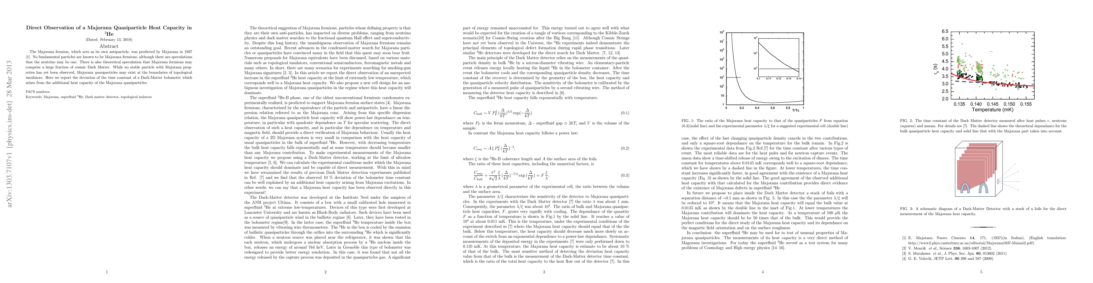 This paper reports the first observation of the heat capacity of Majorana quasiparticles using a $^3$He dark matter detector, providing evidence for their existence as quasiparticles in topological insulators. The detection reveals a deviation in the Dark Matter bolometer time constant, attributed to the additional heat capacity of Majorana fermions.