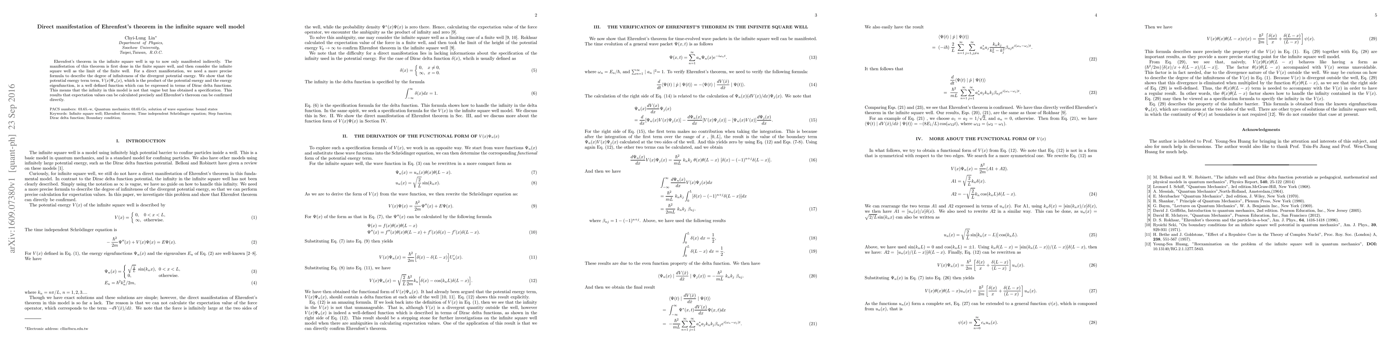 The paper presents a direct manifestation of Ehrenfest's theorem in the infinite square well model by showing that the potential energy term can be expressed using Dirac delta functions, providing a precise description of the infinite potential. This allows for the precise calculation of expectation values and a direct confirmation of Ehrenfest's theorem.