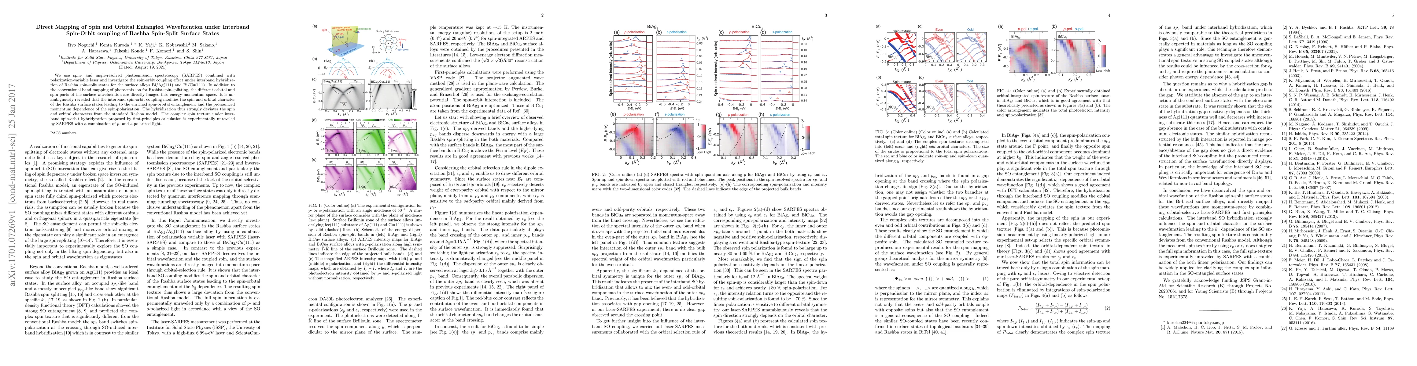 We use spin- and angle-resolved photoemission spectroscopy (SARPES) combined with polarization-variable laser and investigate the spin-orbit coupling effect under interband hybridization of Rashba spin-split states for the surface alloys Bi/Ag(111) and Bi/Cu(111). In addition to the conventional band mapping of photoemission for Rashba spin-splitting, the different orbital and spin parts of the surface wavefucntion are directly imaged into energy-momentum space. It is unambiguously revealed that the interband spin-orbit coupling modifies the spin and orbital character of the Rashba surface states leading to the enriched spin-orbital entanglement and the pronounced momentum dependence of the spin-polarization. The hybridization thus strongly deviates the spin and orbital characters from the standard Rashba model. The complex spin texture under interband spin-orbit hybridyzation proposed by first-principles calculation is experimentally unraveled by SARPES with a combination of p- and s-polarized light.