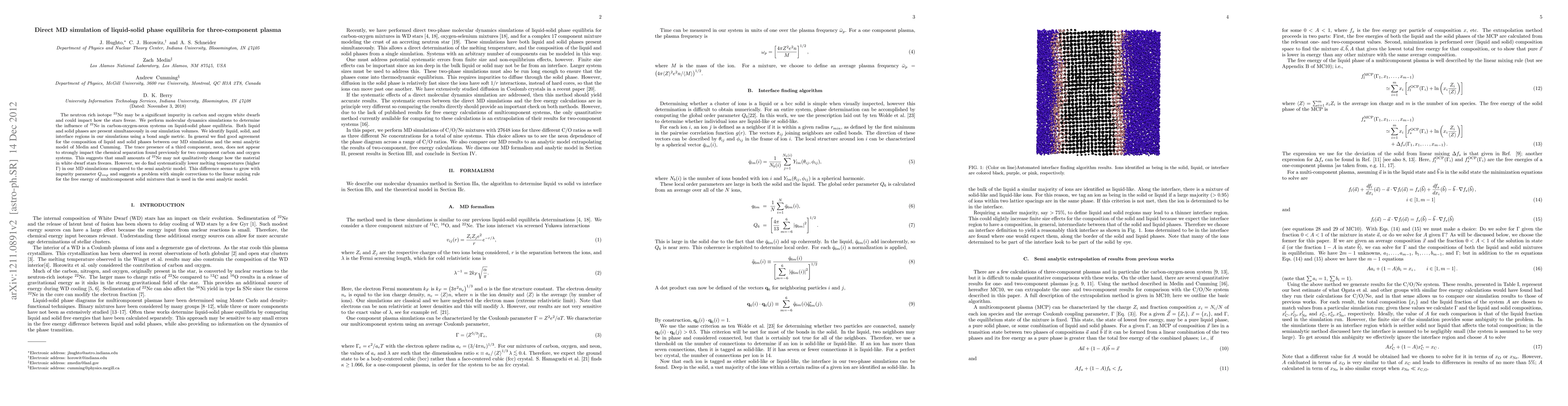 The neutron rich isotope 22Ne may be a significant impurity in carbon and oxygen white dwarfs and could impact how the stars freeze. We perform molecular dynamics simulations to determine the influence of 22Ne in carbon-oxygen-neon systems on liquid-solid phase equilibria. Both liquid and solid phases are present simultaneously in our simulation volumes. We identify liquid, solid, and interface regions in our simulations using a bond angle metric. In general we find good agreement for the composition of liquid and solid phases between our MD simulations and the semi analytic model of Medin and Cumming. The trace presence of a third component, neon, does not appear to strongly impact the chemical separation found previously for two component carbon and oxygen systems. This suggests that small amounts of 22Ne may not qualitatively change how the material in white dwarf stars freezes. However, we do find systematically lower melting temperatures (higher Gamma) in our MD simulations compared to the semi analytic model. This difference seems to grow with impurity parameter Q_imp and suggests a problem with simple corrections to the linear mixing rule for the free energy of multicomponent solid mixtures that is used in the semi analytic model.