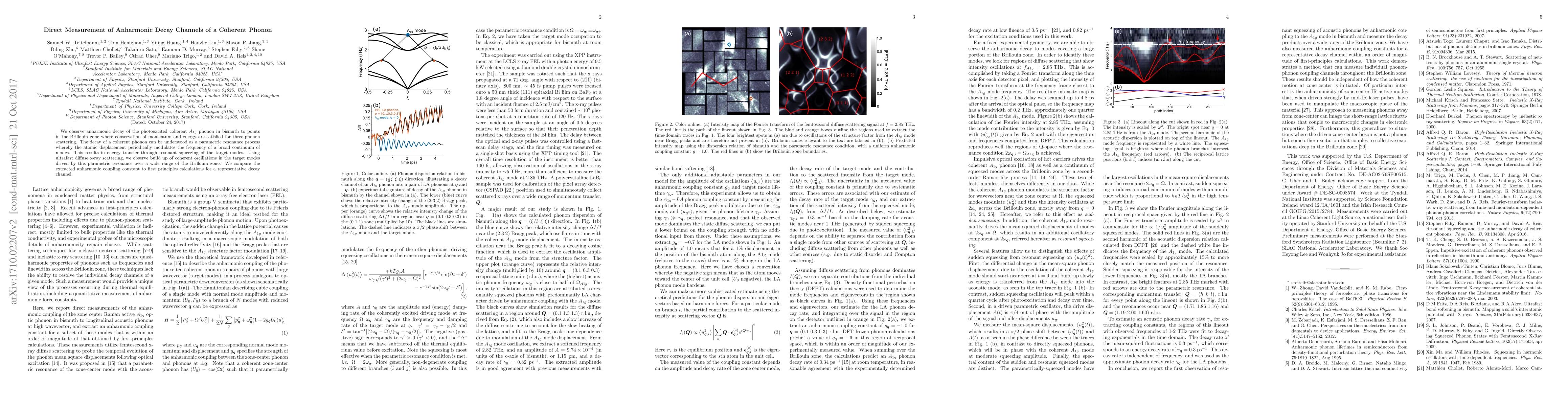 This study directly measures the anharmonic decay of a photoexcited coherent A1g phonon in bismuth through three-phonon scattering, revealing energy transfer via parametric resonance. Ultrafast diffuse x-ray scattering detects the resulting coherent oscillations, and the anharmonic coupling constant is compared with first principles calculations.