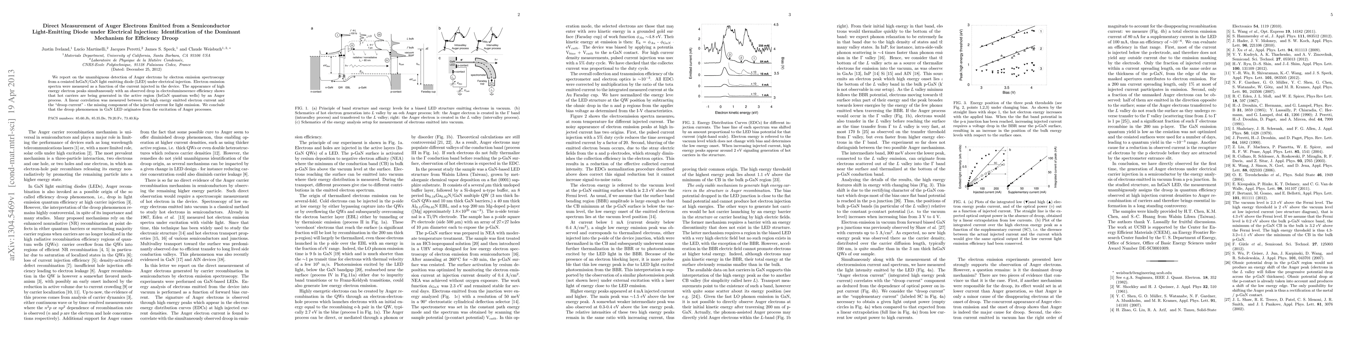 This study directly measures Auger electrons from an InGaN/GaN LED under electrical injection, revealing a linear correlation between high energy electron emission and efficiency droop, indicating that Auger processes are the dominant mechanism for the droop phenomenon.