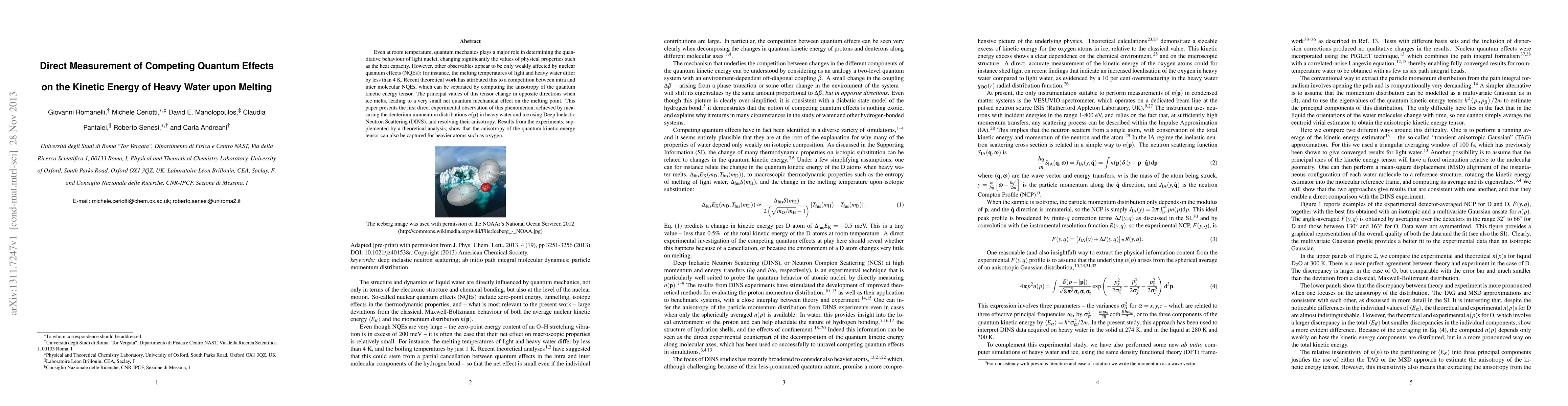 This paper reports the first direct experimental observation of competing quantum effects on the kinetic energy of heavy water upon melting, using Deep Inelastic Neutron Scattering to measure deuterium momentum distributions. The results reveal the anisotropy of the quantum kinetic energy tensor, confirming theoretical predictions of the minimal net quantum mechanical effect on the melting point.