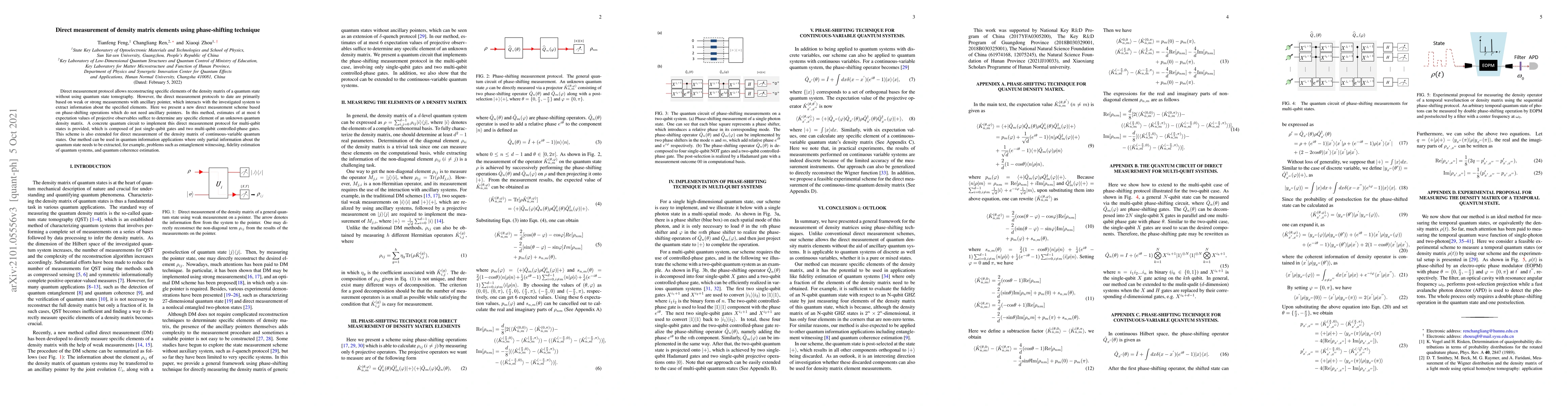 A direct measurement protocol allows reconstructing specific elements of the density matrix of a quantum state without using quantum state tomography. However, the direct measurement protocols to date are primarily based on weak or strong measurements with an ancillary pointer, which interacts with the investigated system to extract information about the specified elements. Here, we present a direct measurement scheme based on phase-shifting operations which do not need ancillary pointers. In this method, estimates of at most six expectation values of projective observables suffice to determine any specific element of an unknown quantum density matrix. A concrete quantum circuit to implement this direct measurement protocol for multiqubit states is provided, which is composed of just single-qubit gates and two multiqubit controlled-phase gates. This scheme is also extended for the direct measurement of the density matrix of continuous-variable quantum states. Our method can be used in quantum information applications where only partial information about the quantum state needs to be extracted, for example, problems such as entanglement witnessing, fidelity estimation of quantum systems, and quantum coherence estimation.