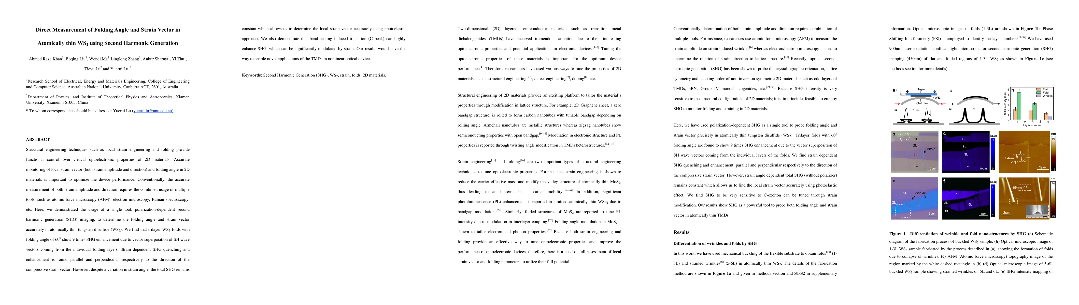 This paper demonstrates the use of polarization-dependent second harmonic generation (SHG) imaging to accurately measure the folding angle and strain vector in atomically thin WS$_2$. The study finds that trilayer WS$_2$ with a 60° folding angle shows a significant 9-fold SHG enhancement due to vector superposition, and strain-dependent SHG effects can be precisely determined using a photoelastic approach.