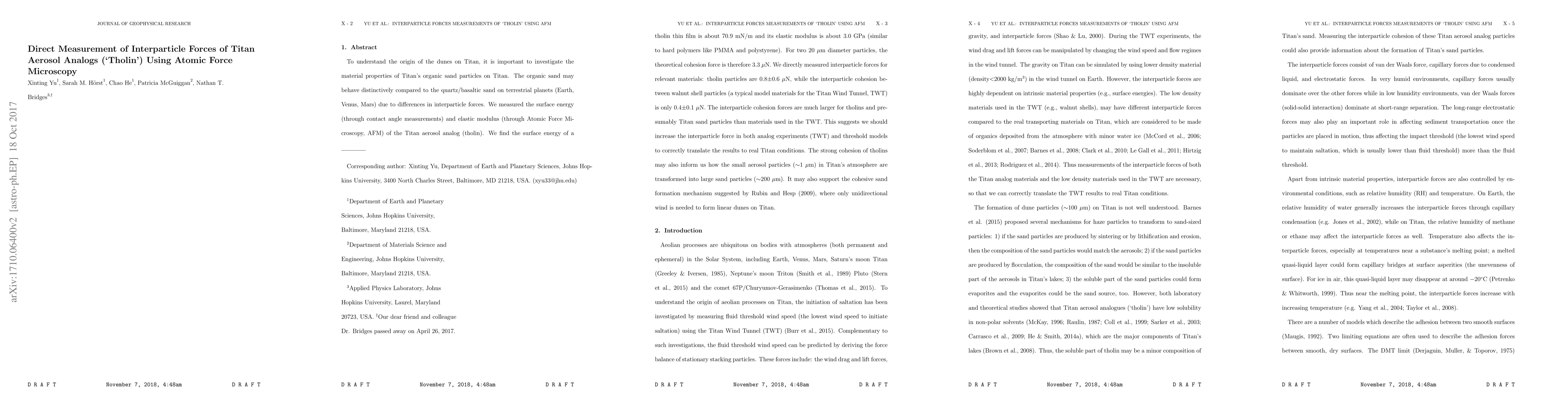 To understand the origin of the dunes on Titan, it is important to investigate the material properties of Titan's organic sand particles on Titan. The organic sand may behave distinctively compared to the quartz/basaltic sand on terrestrial planets (Earth, Venus, Mars) due to differences in interparticle forces. We measured the surface energy (through contact angle measurements) and elastic modulus (through Atomic Force Microscopy, AFM) of the Titan aerosol analog (tholin). We find the surface energy of a tholin thin film is about 70.9 mN/m and its elastic modulus is about 3.0 GPa (similar to hard polymers like PMMA and polystyrene). For two 20 $\mu$m diameter particles, the theoretical cohesion force is therefore 3.3 $\mu$N. We directly measured interparticle forces for relevant materials: tholin particles are 0.8$\pm$0.6 $\mu$N, while the interparticle cohesion between walnut shell particles (a typical model materials for the Titan Wind Tunnel, TWT) is only 0.4$\pm$0.1 $\mu$N. The interparticle cohesion forces are much larger for tholins and presumably Titan sand particles than materials used in the TWT. This suggests we should increase the interparticle force in both analog experiments (TWT) and threshold models to correctly translate the results to real Titan conditions. The strong cohesion of tholins may also inform us how the small aerosol particles ($\sim$1 $\mu$m) in Titan's atmosphere are transformed into large sand particles ($\sim$200 $\mu$m). It may also support the cohesive sand formation mechanism suggested by Rubin and Hesp (2009), where only unidirectional wind is needed to form linear dunes on Titan.